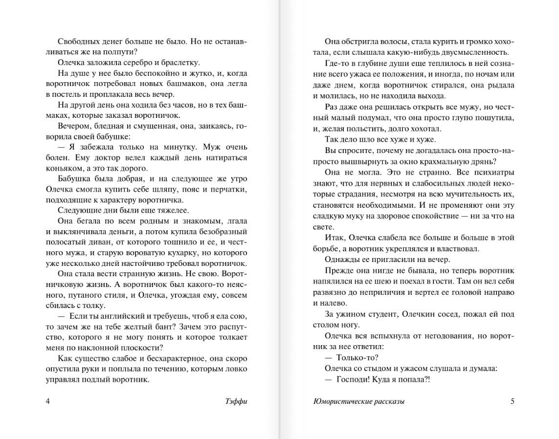 Все они попадают в комичные и нелепые ситуации, и над каждым из них посмеивается Тэффи — с жалостью и снисхождением, но чаще — с тонкой иронией. Остроумие Тэффи поистине великолепно, а ее душевные юмористические рассказы абсолютно искренни, поэтому они и сейчас пользуются заслуженной популярностью.