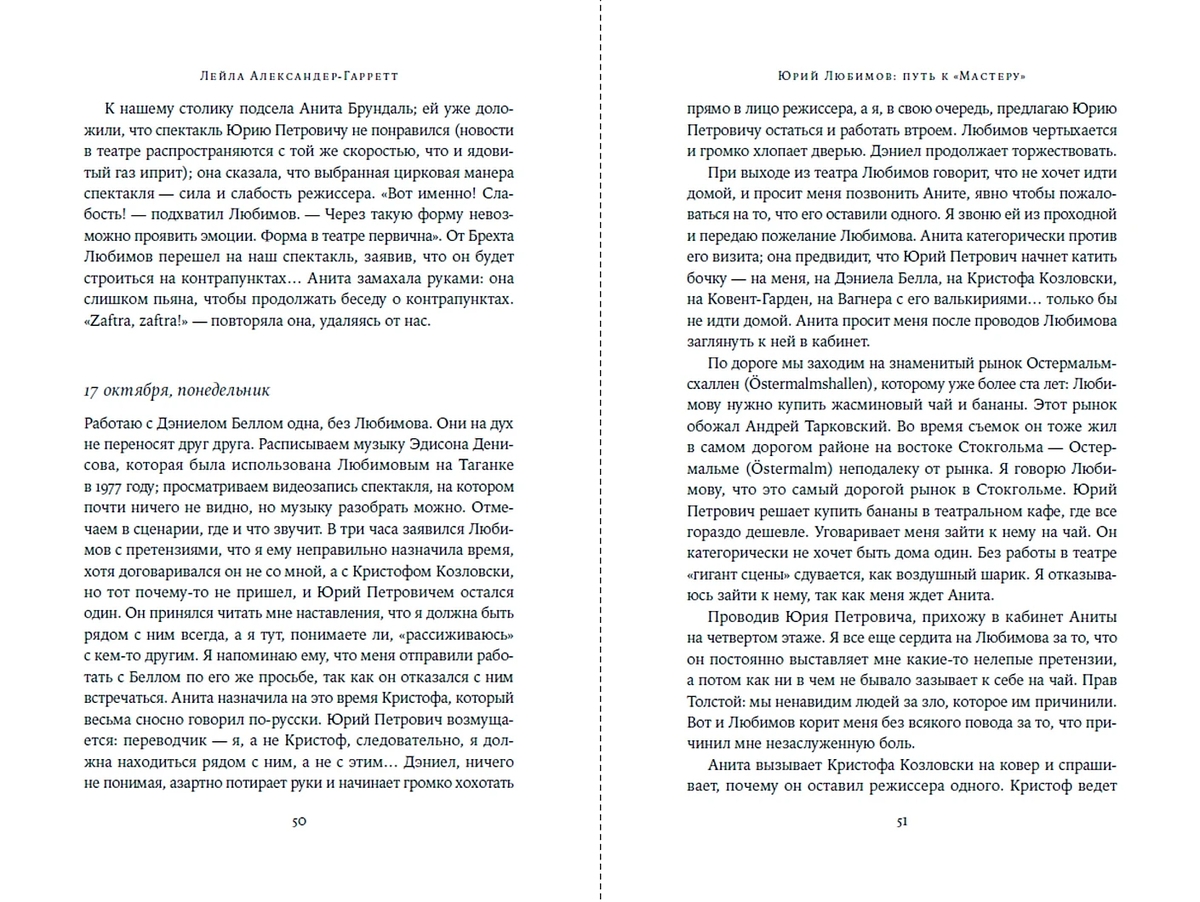 Режиссер легендарного московского Театра на Таганке Юрий Петрович Любимов поставил немало поистине культовых спектаклей. Особое место среди его работ занимает сценическая адаптация «Мастера и Маргариты» — «закатного» романа Михаила Афанасьевича Булгакова. Книга, основанная на дневниковых записях Лейлы Александер-Гарретт, работавшей переводчицей и ассистентом Любимова в лондонском Ковент-Гардене и в стокгольмском Королевском драматическом театре, рассказывает о репетициях спектакля «Мастер и Маргарита» в октябре-декабре 1988 г.