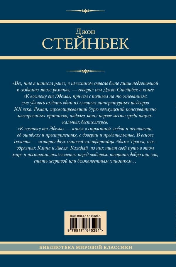 «К востоку от Эдема» – книга о страстной любви и ненависти, об ошибках и преступлениях, о доверии и предательстве. В основе сюжета – история двух сыновей калифорнийца Адама Траска, своеобразных Каина и Авеля. Каждый из них ищет свой путь в этом мире и постоянно оказывается перед выбором: творить добро или зло, стать жертвой или безжалостным хищником…