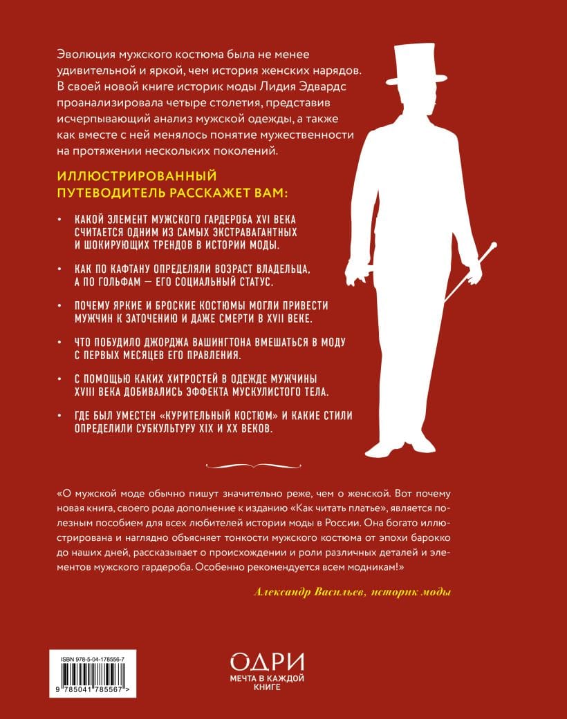 Новая книга историка моды и автора бестселлера «Как читать платье» Лидии Эдвардс — это исчерпывающий путеводитель по эволюции мужской моды и костюма на протяжении четырех столетий. Книга станет идеальным пособием для тех, кто хочет научиться отличать пальто «честерфилд» от ольстерского; разбираться в стилях денди и тедди-боя; понимать разницу между кафтаном, фраком и смокингом. Вы узнаете, как конструировали предметы одежды и что вдохновляло их создателей в разные времена. Познакомитесь с тем, как менялись фасон, крой и отделка в соответствии с поводом, классовой принадлежностью, возрастом и социальным статусом владельца. Сопровождающий текст кратко познакомит вас с историческим контекстом каждой из эпох, а избранные портреты, редкие фотографии, музейные экспонаты и рекламные материалы с максимальной яркостью проиллюстрируют тот или иной стиль, перенеся вас в далекое прошлое.