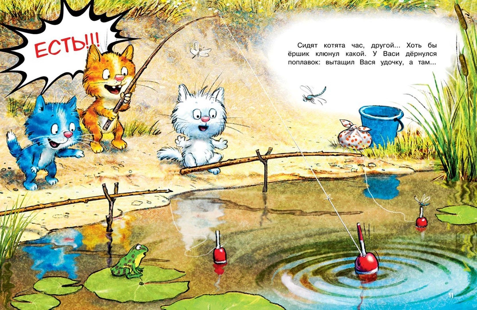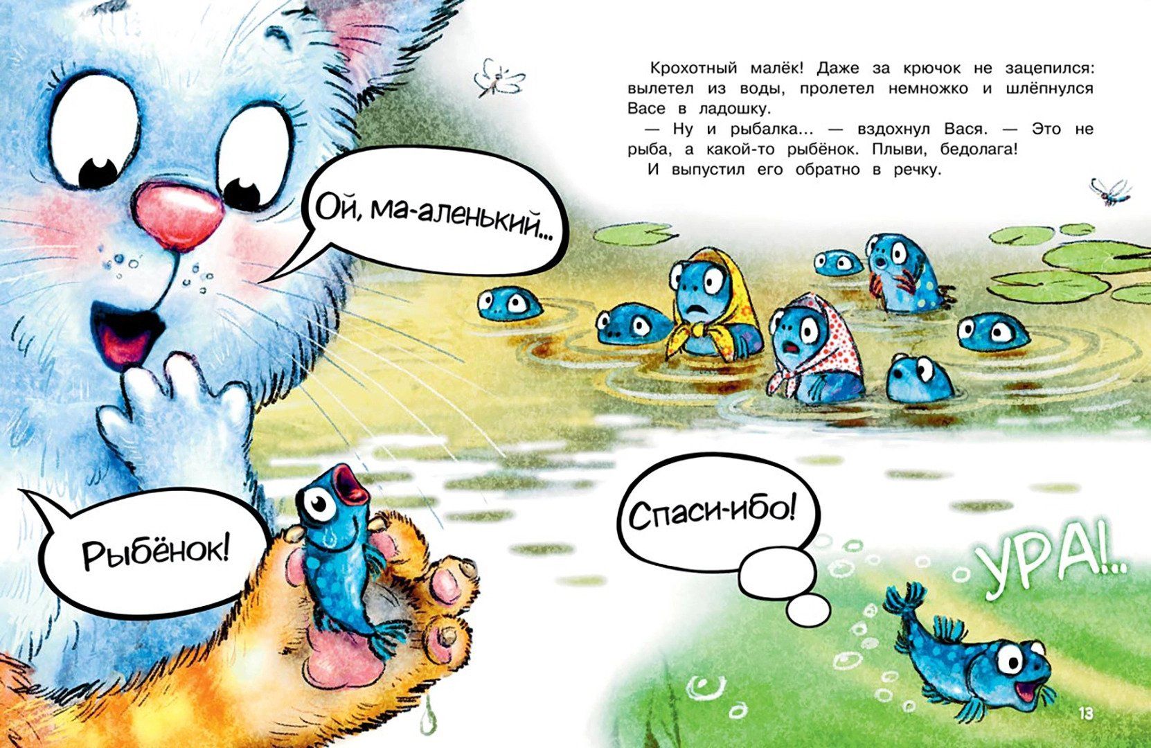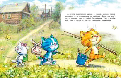 В самой обыкновенной деревне Котофеевке живут самые обыкновенные коты: рыжие, белые и даже… синие! Однажды жарким летним днём трое котят — Вася, Тося и Федя, — отправились удить рыбу на речку Камышку. А кто попался им на крючок, вы узнаете, прочитав новую книжку из серии «У нас в Котофеевке».