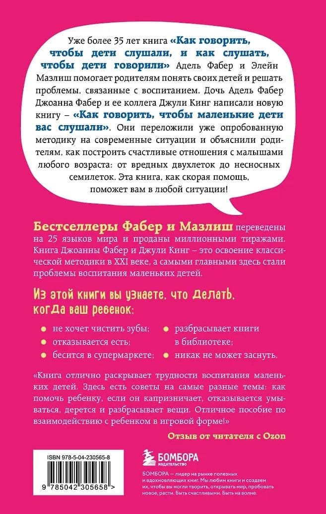 Книга Джоанны Фабер и Джули Кинг «Как говорить, чтобы маленькие дети вас слушали» — это освоение классической методики в XXI веке, а самым главным здесь стали проблемы воспитания маленьких детей. Книга родилась по многочисленным просьбам родителей. Они хотели получить больше примеров и советов по воспитанию именно маленьких детей. Капризные двухлетки, разрушительные трехлетки, невыносимые четырехлетки, отчаянные пятилетки, эгоцентричные шестилетки и семилетки, которые периодически ведут себя как дикари!