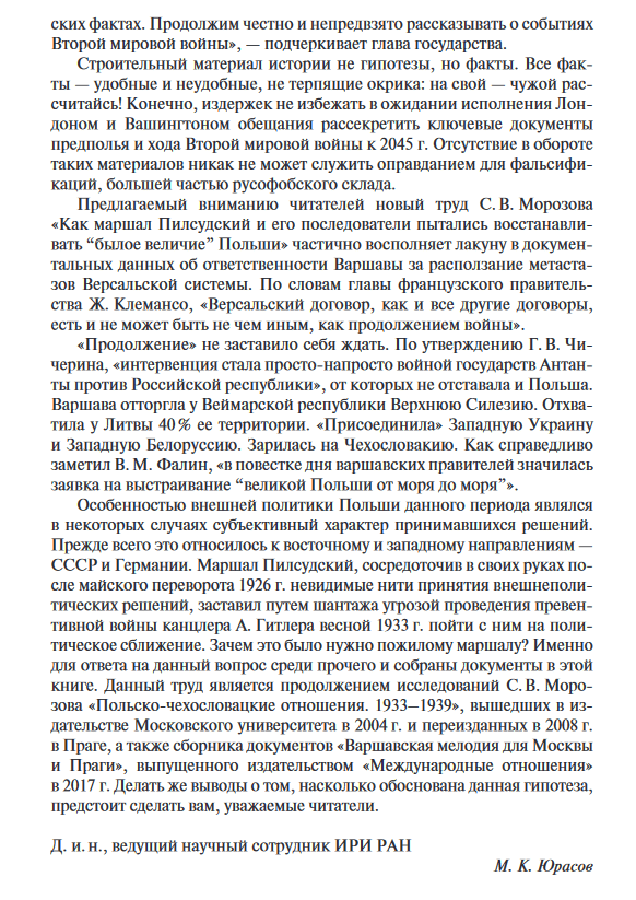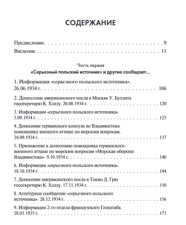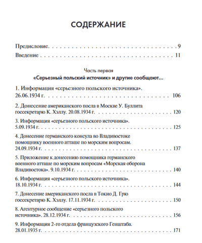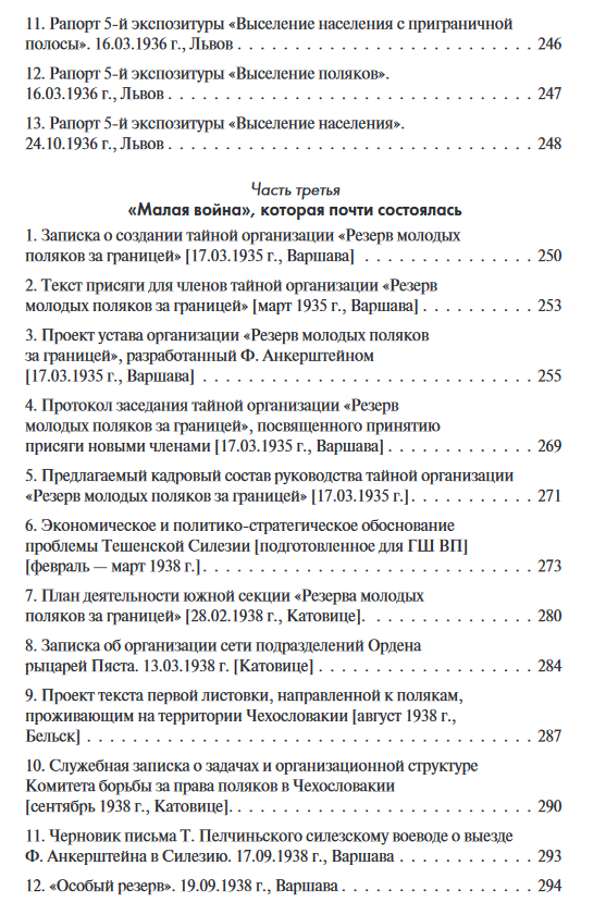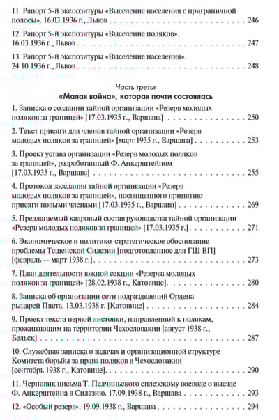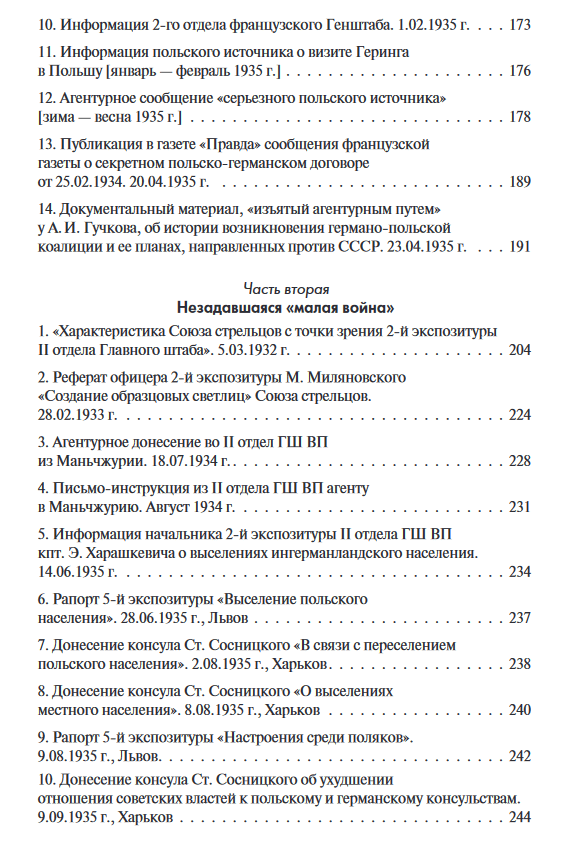 Книга состоит из трех частей. В 1-ю включены документы из так называемого «личного архива И. В. Сталина» – донесений советской разведки, проливающих свет на тайные намерения правящих кругов Польши, Германии и Японии развязать агрессию против СССР в рамках «правового механизма подталкивания Германии на Восток» предположительно во второй половине 1935 г. В ней также содержится текст секретного польско-германского договора от 25 февраля 1934 г. и документы польской разведки о перемещениях потенциальной «пятой колонны» – среди прочих, польского населения с западных областей в глубь СССР в течение 1934–1935 гг. 2-я и 3-я части сборника на документальной основе иллюстрируют тайные пружины «малой войны», то есть механизма, позволявшего тогдашнему политическому руководству Польши создать повод к войне с соседними странами, включая Советский Союз и Чехословакию.