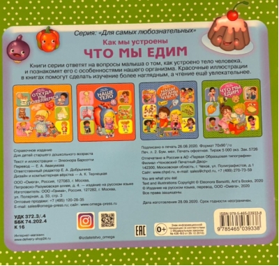 Познавательно-развивающее издание «Как мы устроены. Что мы едим», выпущенное в серии «Для самых любознательных» издательством «Омега», предназначено для совместных занятий взрослых с детьми дошкольного возраста. В занимательной форме оно расскажет Вашему ребёнку о том, как правильно питаться и как сохранить зубы.