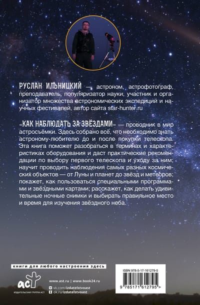 «Как наблюдать за звёздами» — проводник в мир астросъёмки. Здесь собрано всё, что необходимо знать астроному-любителю до и после покупки телескопа. Эта книга поможет разобраться в терминах и характеристиках оборудования и даст практические рекомендации по выбору первого телескопа и уходу за ним; научит проводить наблюдения самых разных космических объектов — от Луны и планет до звёзд и метеоров; покажет, как пользоваться специальными программами и звёздными картами; расскажет, как делать удивительные ночные снимки и выбирать правильное место и время для изучения звёздного неба.