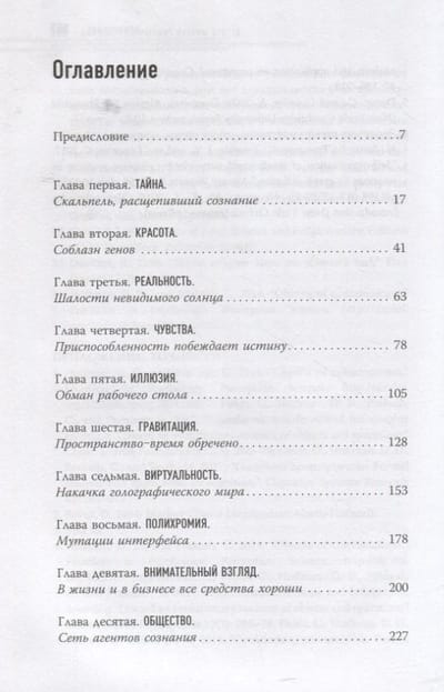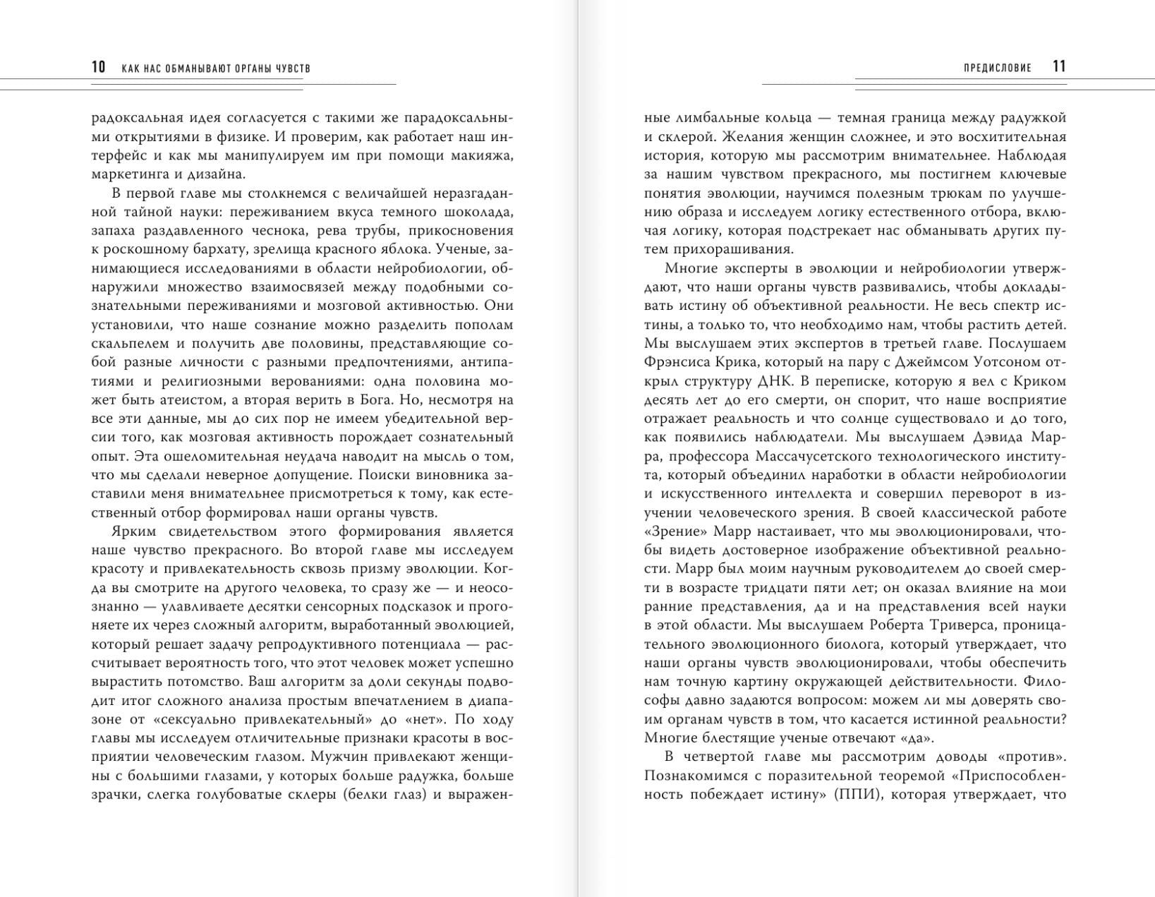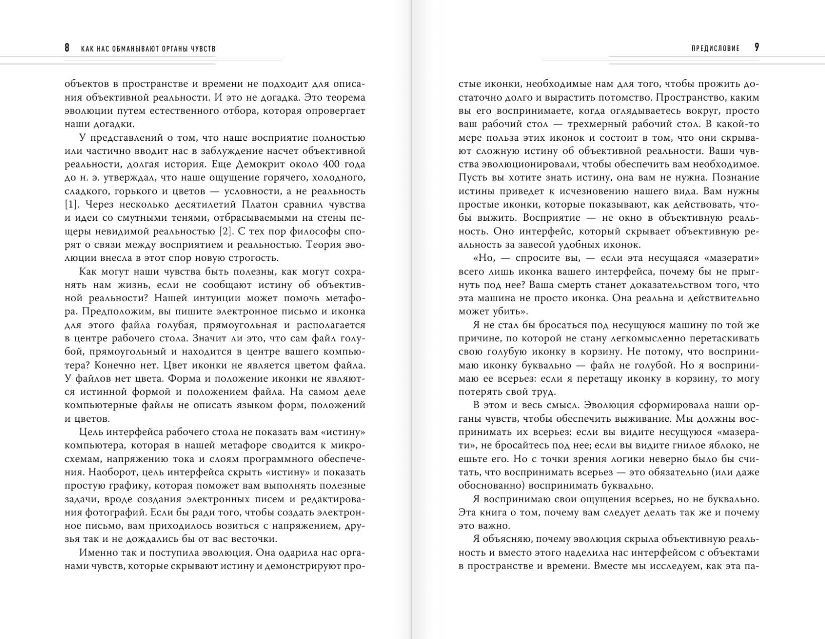 Мы видим мчащийся автомобиль, но не перебегаем перед ним дорогу; мы видим плесень на хлебе, но не едим его. По мнению автора, все эти впечатления не являются объективной реальностью. Последствия такого восприятия огромны: модельеры шьют более приятные к восприятию силуэты, а в рекламных кампаниях используются определенные цвета, чтобы захватить наше внимание. Только исказив реальность, мы можем легко и безопасно перемещаться по миру. Дональд Дэвид Хоффман — американский когнитивный психолог и автор научно‑популярных книг. Он является профессором кафедры когнитивных наук Калифорнийского университета, совмещая работу на кафедрах философии и логики. Его исследования в области восприятия, эволюции и сознания получили премию Троланда Национальной академии наук США.