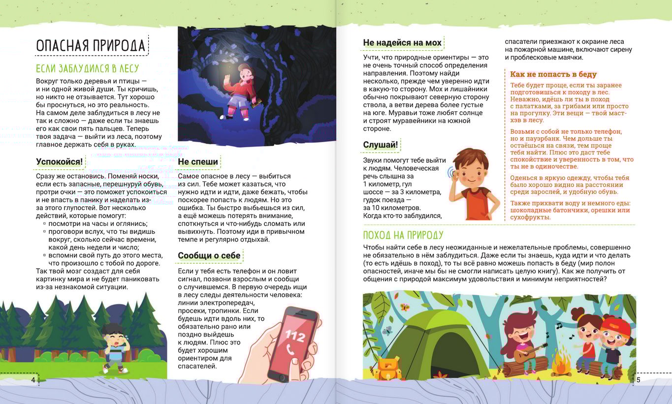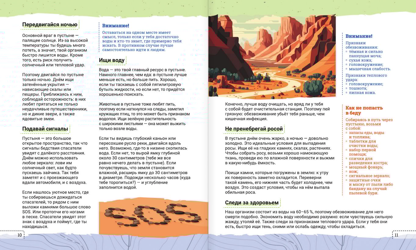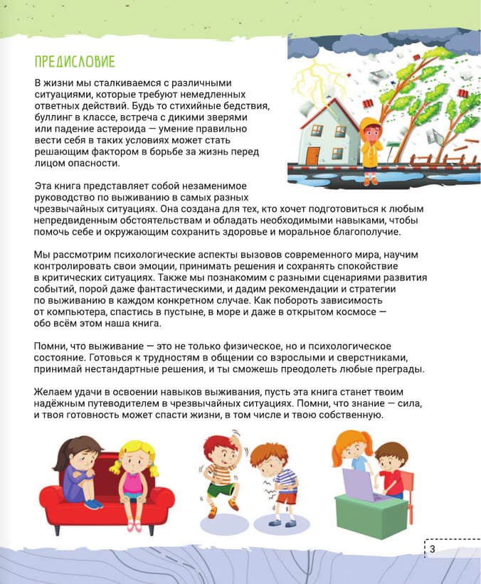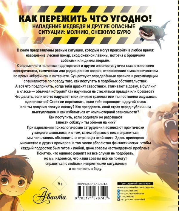В книге рассмотрено множество примеров и приведены советы на все случаи жизни, порой даже фантастические. Это и выживание в пустыне, и нападение акулы, и эвакуация при наводнении, и компьютерная зависимость, и даже падение в космическую чёрную дыру и восстание машин. Каждая статья сопровождается интересными фактами, а также советами, как поступить в той или иной ситуации, чтобы не попасть в беду. Удачи в освоении навыков выживания! Пусть эта книга станет твоим надёжным путеводителем в чрезвычайных ситуациях. Помни, что знание — сила, и твоя готовность может спасти жизни, в том числе и твою собственную.
