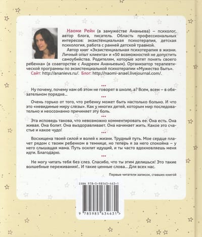 В психологических статьях часто пишут, что любовь к себе - ключ к тому, чтобы и все остальное наладилось. Но как полюбить себя?.. Обрести внутри Любящую Маму для своего Внутреннего Ребенка. Ощутить его внутри себя и полюбить. Это долгий и очень непростой путь. Но встреча с Ребенком дает много радости и сил, поддержки. Когда он услышан, понят и любим, - с ним приходят идеи, удовольствие от жизни, энергия и вдохновение. Наоми Рейн пишет о своем опыте психотерапии, в процессе которой она знакомилась с Ребенком и другими внутренними фигурами. Дневниковые записи автора дополнены анализом ситуации с точки зрения практикующего психотерапевта. Книга предлагает сделать один из первых шагов: попробовать услышать голосок Внутреннего Ребенка и ответить ему.