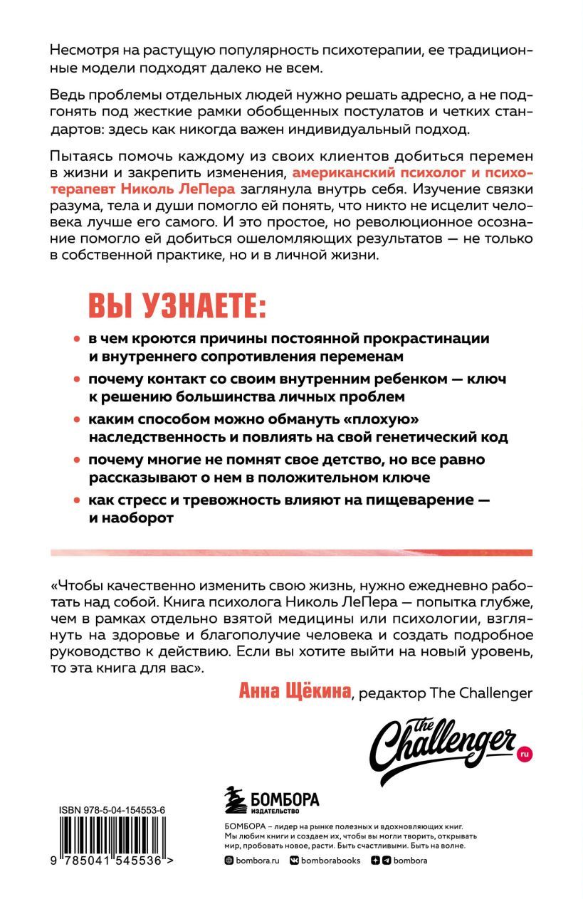 Пытаясь помочь каждому из своих клиентов добиться перемен в жизни и закрепить изменения, американский психолог и психотерапевт Николь ЛеПера заглянула внутрь себя. Изучение связки разума, тела и души помогло ей понять, что никто не исцелит человека лучше него самого. И это простое, но революционное осознание помогло ей добиться ошеломляющих результатов — не только в собственной практике, но и в личной жизни. Сегодня блог создательницы «холистической психологии» читают более 4 миллионов человек, а ее инструментами пользуются люди со всех концов света. ЛеПера показывает, как травмы детства могут проявляться в настоящем и будущем: это не только абьюз и созависимость в отношениях или эмоциональная незрелость, но и в буквальном смысле проблемы со здоровьем. Но все это решаемо — если взять свое исцеление в свои же руки.
