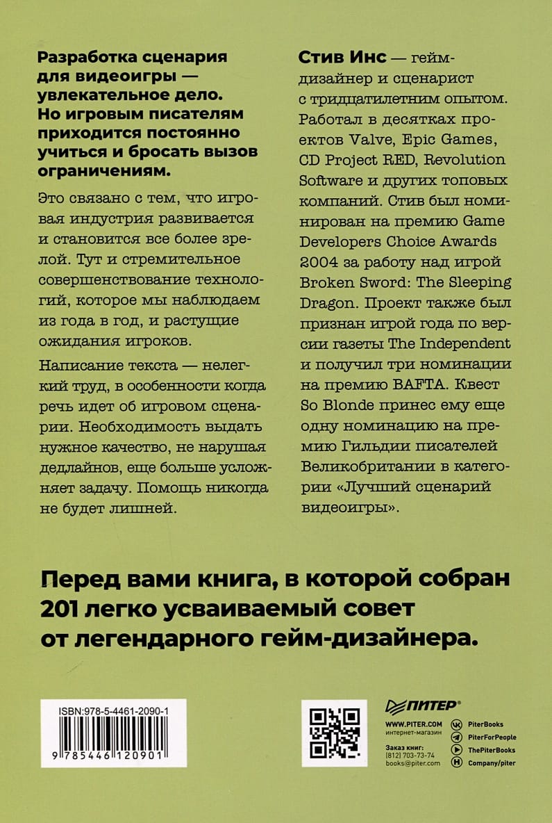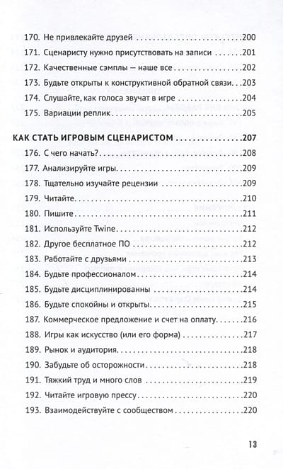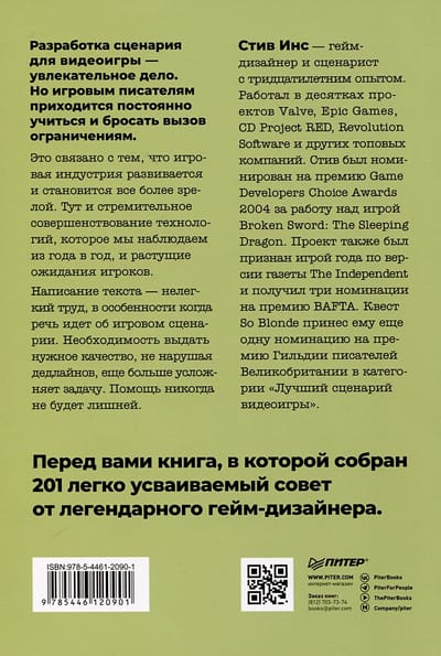 Это связано с тем, что игровая индустрия развивается и становится все более зрелой. Тут и стремительное совершенствование технологий, которое мы наблюдаем из года в год, и растущие ожидания игроков. Написание текста — нелегкий труд, в особенности когда речь идет об игровом сценарии. Необходимость выдать нужное качество, не нарушая дедлайнов, еще больше усложняет задачу. Помощь никогда не будет лишней. Перед вами книга, в которой собран 201 легко усваиваемый совет от легендарного геймдизайнера.