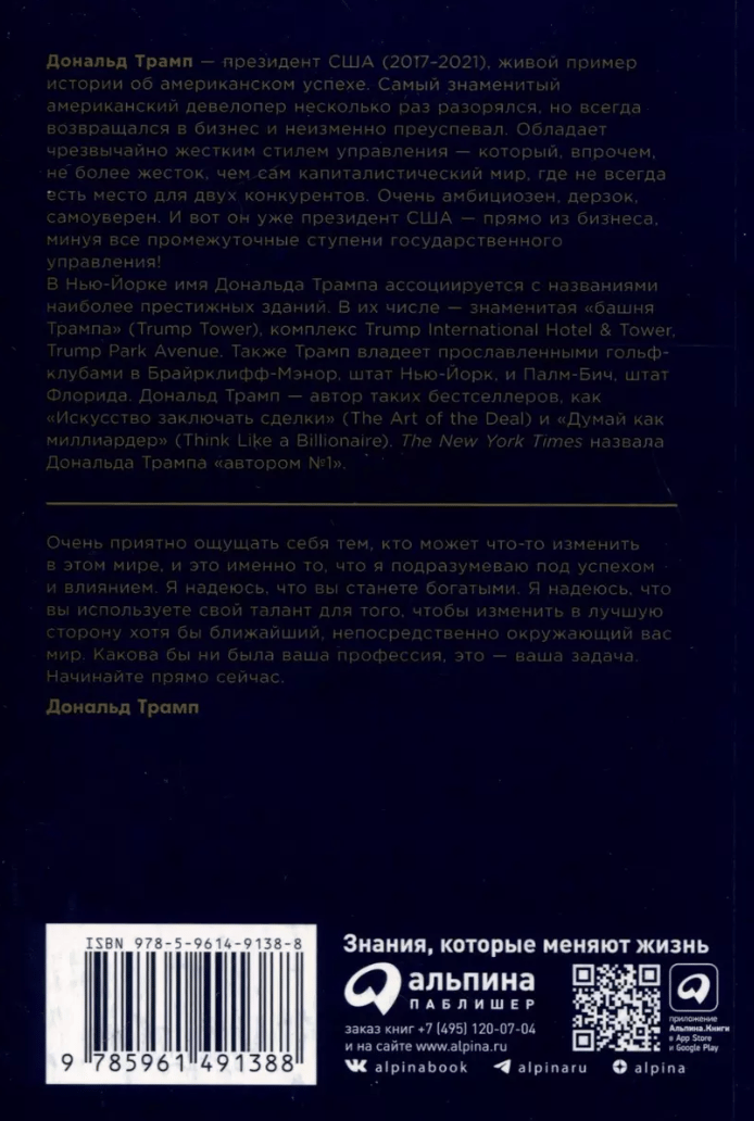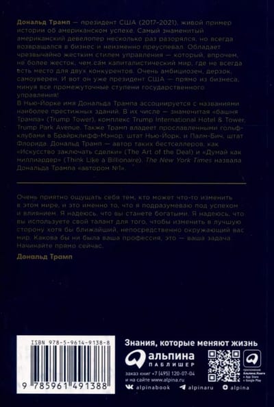 «Деньги, сами по себе, не конечная цель, но иногда они — наиболее эффективное средство реализации наших мечтаний. Если у вас есть грандиозная мечта и вы ищете пути претворения ее в жизнь, эта книга для вас». Так, издалека, начинает рассказ о своем успехе один из избранных — богатый и успешный человек, к тому же баллотирующийся в президенты Соединенных Штатов. Дальше он пишет о том, как делать деньги, не зацикливаясь на них. Повторяя основную мысль из своей предыдущей книги «Искусство заключать сделки», Трамп утверждает: надо любить то, что делаешь, и никогда не думать лишь о материальном. Умение грамотно зарабатывать и вкладывать деньги, правильно управлять своими сотрудниками и мотивировать их на общий успех, обеспечивать общение персонала с высшим руководством — вот то, чему можно научиться, следуя правилам Трампа. А также узнать, как и при каких обстоятельствах зарождалась передача The Apprentice.