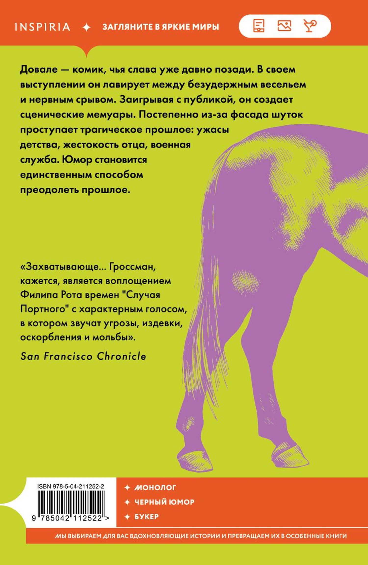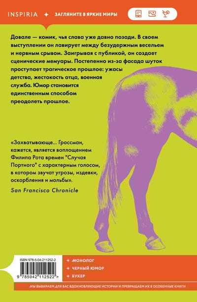 «Лошадь заходит в бар» — это трогательное исследование того, как люди противостоят cложным жизненным перипетиям с помощью острого слова. За этот роман Давид Гроссман был удостоен Международной Букеровской премии.
