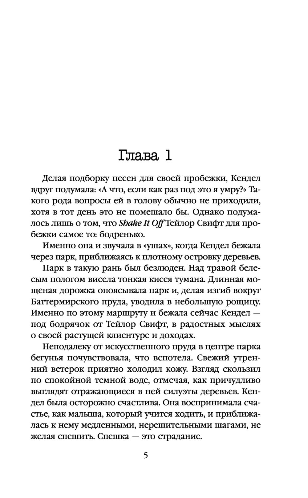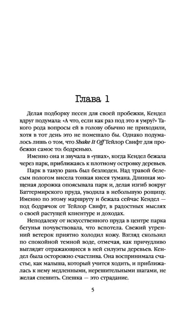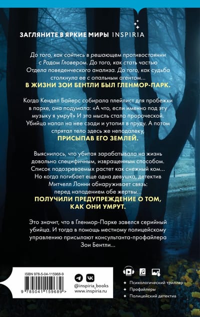 Предыстория супербестселлера «Внутри убийцы». До того, как сойтись в решающем противостоянии с Родом Гловером. До того, как стать частью Отдела Поведенческого Анализа. До того, как судьба столкнула ее с опальным агентом… в жизни Зои Бентли был Гленмор-Парк. Когда Кендел Байерс собирала плейлист для пробежки в парке, она подумала: «А что, если именно под эту музыку я умру?». И эта мысль стала пророческой. Убийца напал на нее сзади и утопил в пруду. А потом спрятал тело здесь же неподалеку, присыпав его землей. Выяснилось, что убитая зарабатывала на жизнь довольно специфичным, извращенным способом. Список подозреваемых растет как снежный ком… Но когда погибает еще одна девушка, детектив Митчелл Лонни обнаруживает связь: перед нападением обе жертвы получили предупреждение о том, как они умрут. Это значит, что в Гленмор-Парке завелся серийный убийца. И тогда в помощь местному полицейскому управлению присылают консультанта-профайлера Зои Бентли…