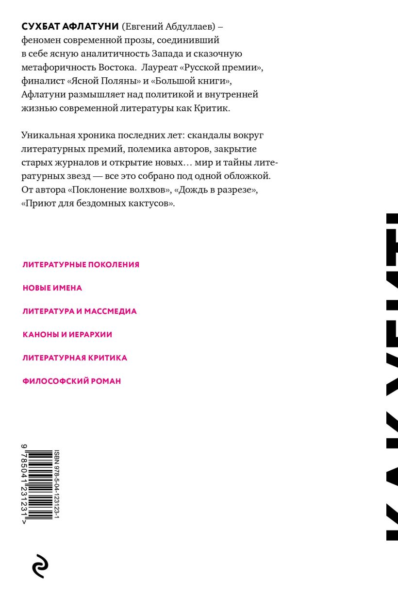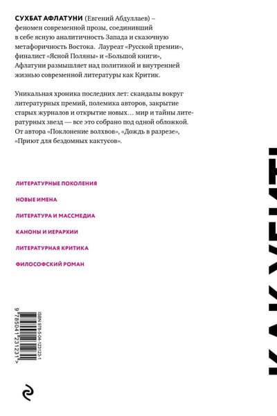 Сухбат Афлатуни (Евгений Абдуллаев) – феномен современной прозы, соединивший в себе ясную аналитичность Запада и сказочную метафоричность Востока. Лауреат «Русской премии», финалист «Ясной поляны» и «Большой книги», - Афлатуни размышляет над политикой и внутренней жизнью современной литературы как Критик. Уникальная хроника последних лет: скандалы вокруг литературных премий, полемика авторов, закрытие старых журналов и открытие новых… мир и тайны литературных звезд, все это собрано под одной обложкой. От автора «Поклонение волхвов», «Дождь в разрезе», «Приют для бездомных кактусов».