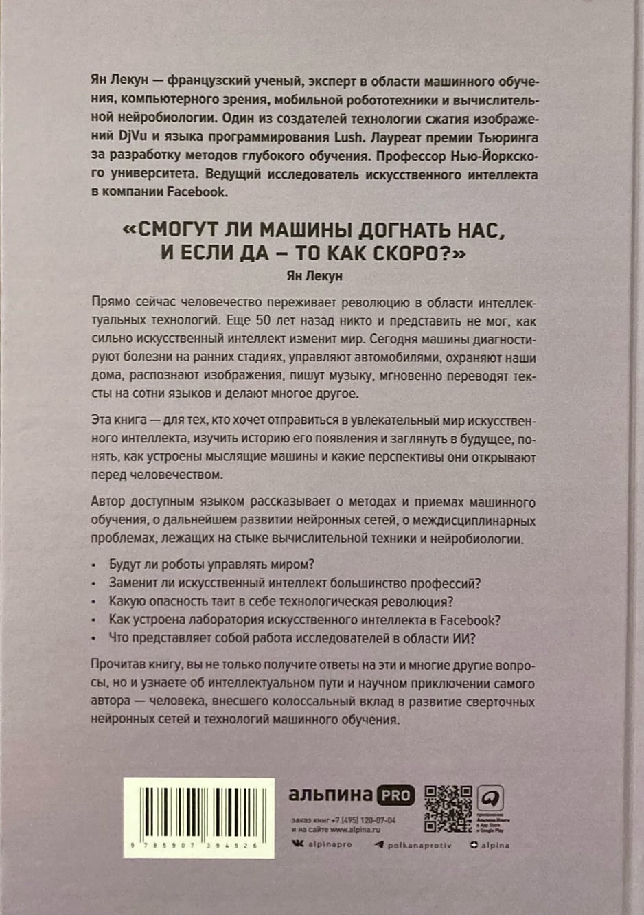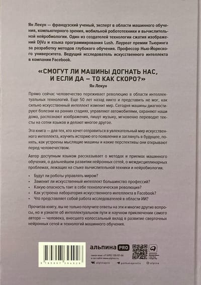 Автор книги Ян Лекун стоит у истоков этой революции. Лауреат премии Тьюринга, профессор Нью-Йоркского университета и руководитель фундаментальными исследованиями, он является одним из изобретателей глубокого обучения, применяемого к так называемым искусственным нейронным сетям, архитектура и функционирование которых вдохновлены устройством человеческого мозга. В своей книге он, не прибегая к метафорам, делится своим научным подходом на стыке компьютерных наук и нейробиологии, проливая свет на будущее искусственного интеллекта, связанные с ним проблемы и перспективы.