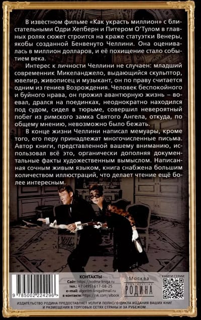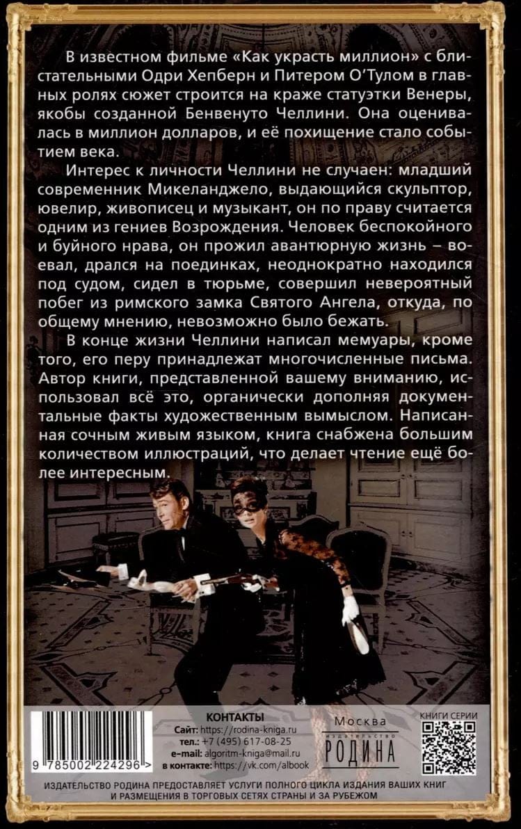 В известном фильме «Как украсть миллион» с блистательными Одри Хепберн и Питером О’Тулом в главных ролях сюжет строится на краже статуэтки Венеры, якобы созданной Бенвенуто Челлини. Она оценивалась в миллион долларов, и её похищение стало событием века. Интерес к личности Челлини не случаен: младший современник Микеланджело, выдающийся скульптор, ювелир, живописец и музыкант он по праву считается одним из гениев Возрождения. Человек беспокойного и буйного нрава, он прожил авантюрную жизнь – воевал, дрался на поединках, неоднократно находился под судом, сидел в тюрьме, совершил невероятный побег из римского замка Святого Ангела, откуда, по общему мнению, невозможно было бежать. В конце жизни Челлини написал мемуары, кроме того, его перу принадлежат многочисленные письма. Автор книги, представленной вашему вниманию, использовал всё это, органически дополняя документальные факты художественным вымыслом. Написанная сочным живым языком, книга снабжена большим количеством иллюстраций, что делает чтение ещё более интересным.