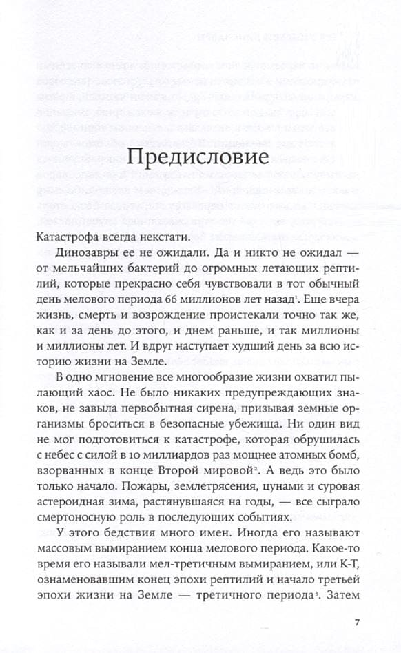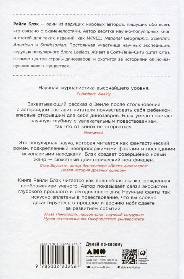 Эта книга уникальна. Райли Блэк воспроизводит картину событий массового вымирания мелового периода на примерах конкретных животных так, словно присутствовала там и тогда сама. Все начинается в преддверии катастрофы, а затем, глава за главой, мы следуем по пути героев Райли Блэк в разные дни их жизни: через час, через день, месяц, год, столетие, вплоть до миллиона лет после столкновения нашей планеты с астероидом.
