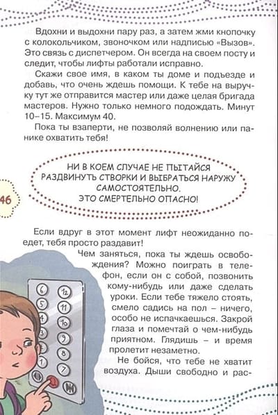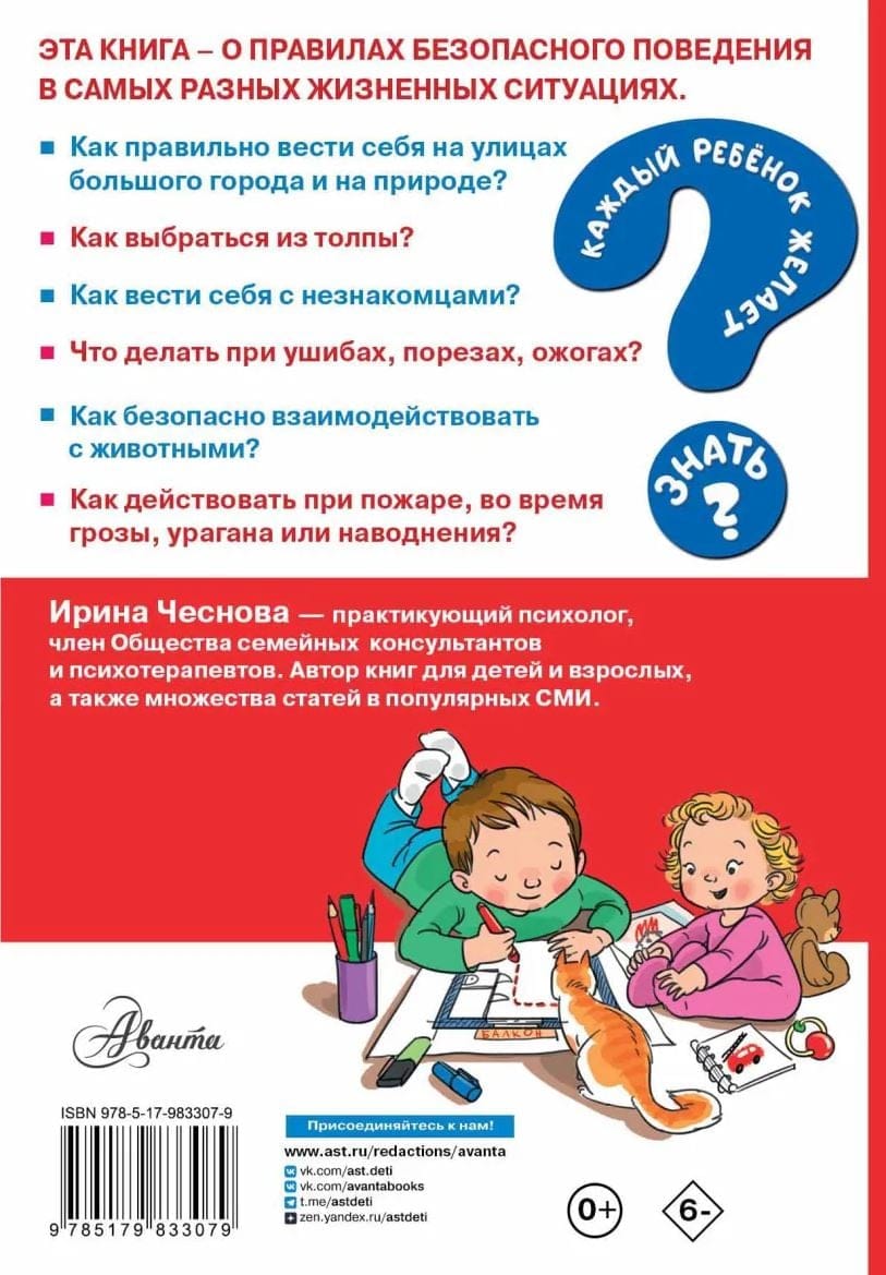 На этот раз известный семейный психолог Ирина Чеснова рассказывает юным читателям о правилах безопасного поведения в самых разных жизненных ситуациях. Как правильно вести себя в лесу, походе и на даче, на улицах большого города и при общении с незнакомцами. Что делать при ушибах, порезах, ожогах. Как действовать при пожаре, во время грозы, урагана или наводнения. Книга поможет сохранить спокойствие в сложных и опасных ситуациях и придаст уверенности в собственных силах.