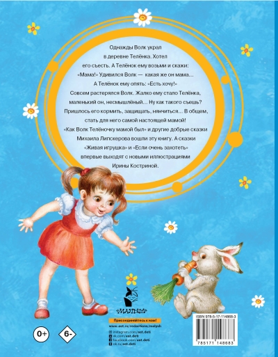 Многие знают мультфильмы, которые были сняты по произведениям Михаила Липскерова: «Волки Телёнок», «Уважаемый Леший», «Живая игрушка» и другие. Добрые и забавные герои этих историй сразу полюбились зрителю, а сами произведения запомнились чувством юмора, по которому сразу узнаётся автор Михаил Липскеров. В книгу вошли четыре сказки: «Как Волк Телёночку мамой был», «Уважаемый Леший», «Живая игрушка», «Если очень захотеть». Все сказки проиллюстрированы художником-кукольником Ириной Костриной, а последние две впервые выходят с её новыми рисунками. Для дошкольного возраста.