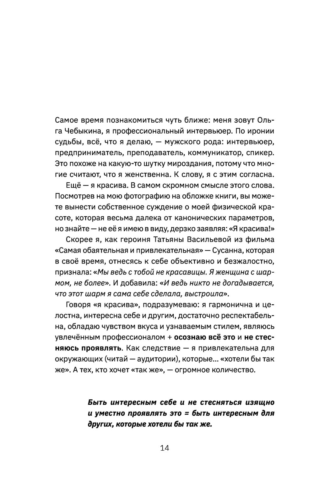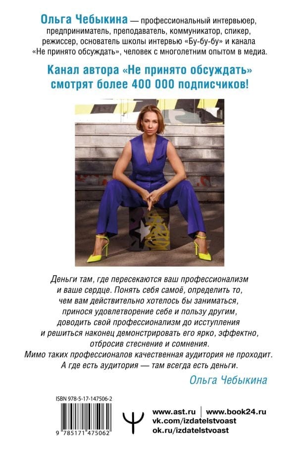 Выход книги Ольги Чебыкиной — профессионального интервьюера, предпринимателя, преподавателя, обладательницы двух серебряных кнопок YouTube, настоящее событие для всех, чьи карьера и хобби связаны с публичными выступлениями. Обладая огромным опытом в медиасфере, автор книги делится секретными ингредиентами успешных публичных выступлений. Словами можно не только побуждать людей действовать, но и зарабатывать! И даже в условиях изменившейся реальности. Эфиры в социальных сетях, выступления на сцене, лекции, деловые встречи — это только малая часть сферы применения навыков, которые вы сможете развить под чутким руководством автора книги. Но даже если вы не связываете свою деятельность с публичными выступлениями, эта книга поможет вам лучше узнать себя, выявить свои сильные стороны, справиться со своими страхами и тревогами, обрести уверенность в себе и выстроить эффективную коммуникацию с окружающими.