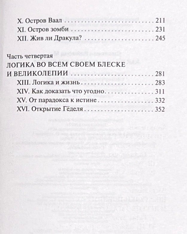 Книга Рэймонда Смаллиана, вероятно, самый увлекательный сборник задач по логике. Около трехсот задач различной сложности сгруппированы по разделам, герои которых Рыцари и Лжецы, Алиса в Стране Чудес, Беллини и Челлини и даже сам граф Дракула!