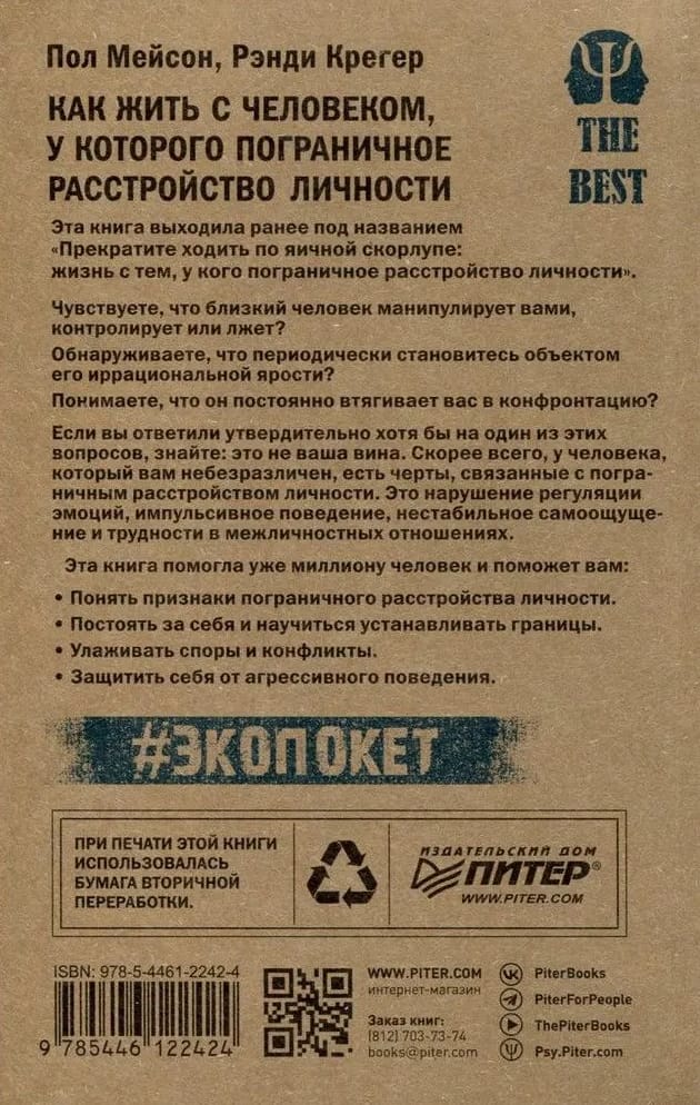 Если вы ответили утвердительно хотя бы на один из этих вопросов, знайте: это не ваша вина. Скорее всего, у человека, который вам небезразличен, есть черты, связанные с пограничным расстройством личности. Это нарушение регуляции эмоций, импульсивное поведение, нестабильное самоощущение и трудности в межличностных отношениях. Эта книга поможет вам: - Понять признаки пограничного расстройства личности; - Постоять за себя и научиться устанавливать границы; - Улаживать споры и конфликты; - Защитить себя от агрессивного поведения.