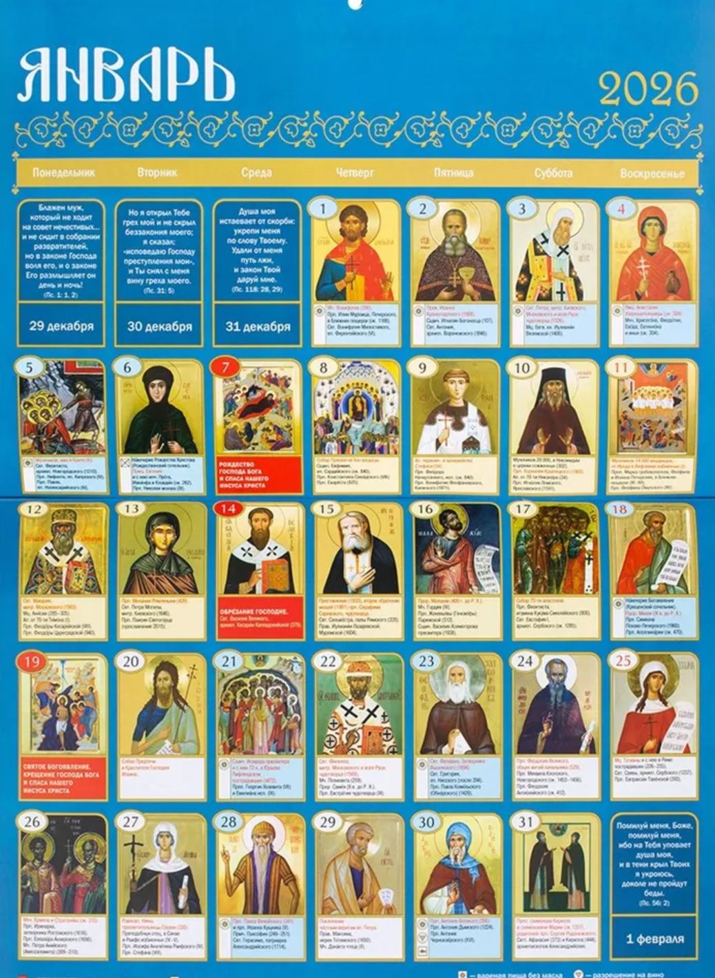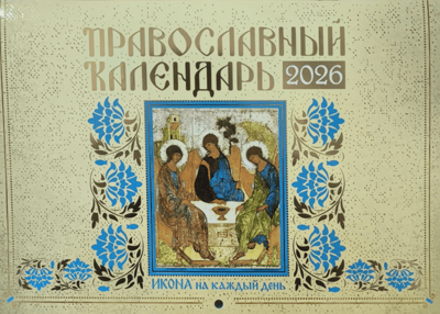Православный настенный перекидной календарь на 2026 год «Икона на каждый день» содержит иконы Господа, Пресвятой Богородицы, Небесных Сил Бесплотных, угодников Божиих на каждый день. Использована многоцветная печать, тиснение золотой фольгой.
