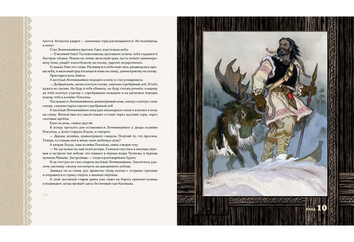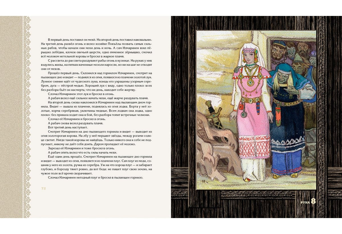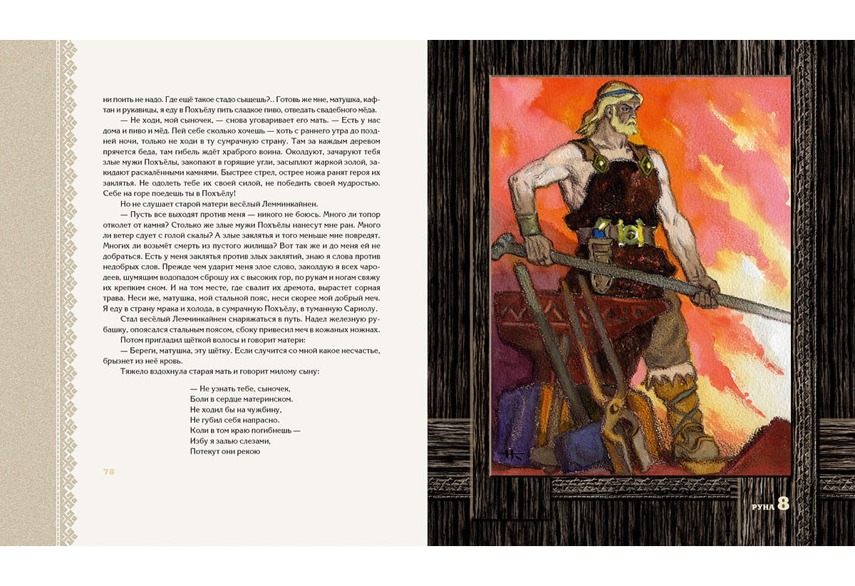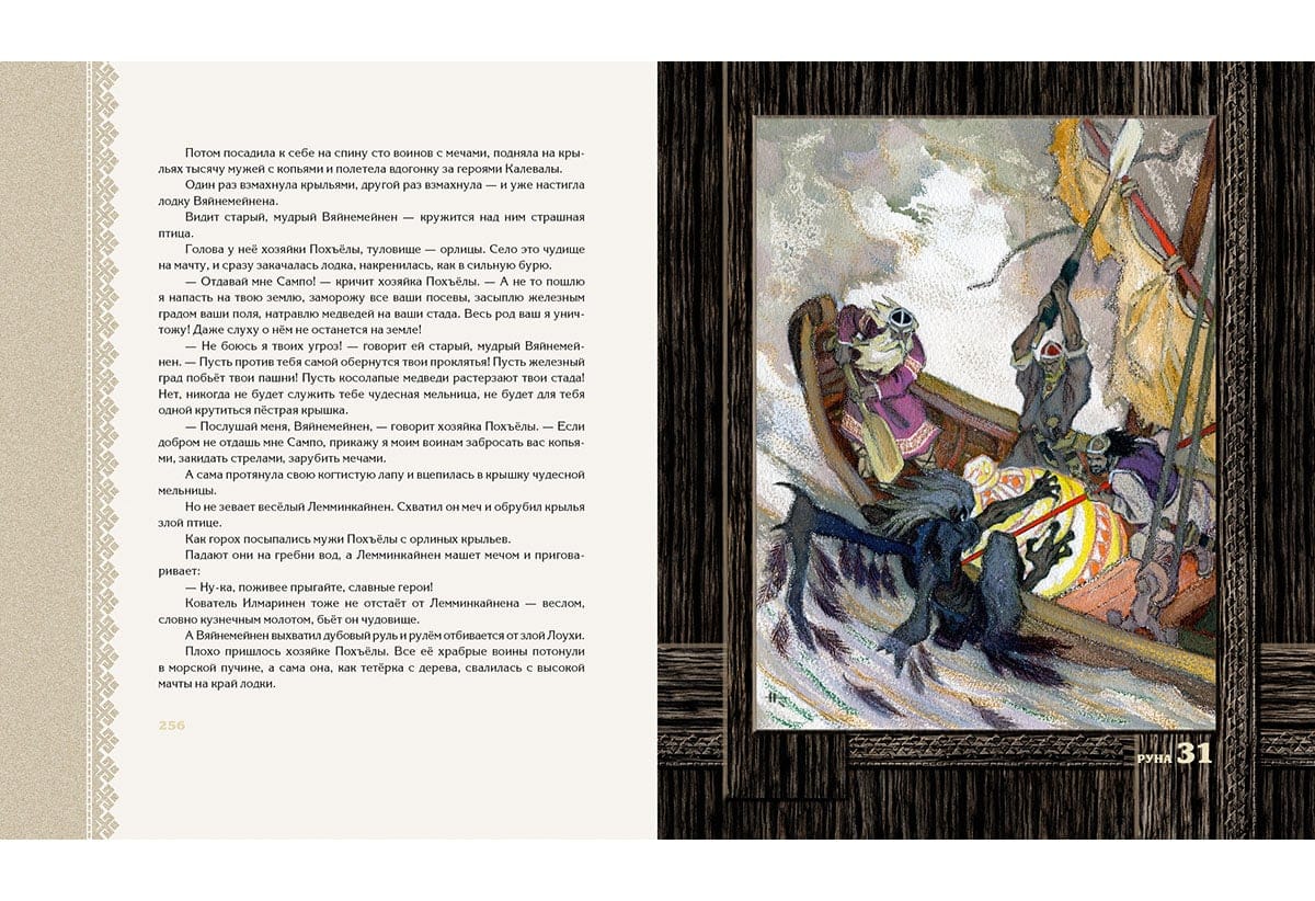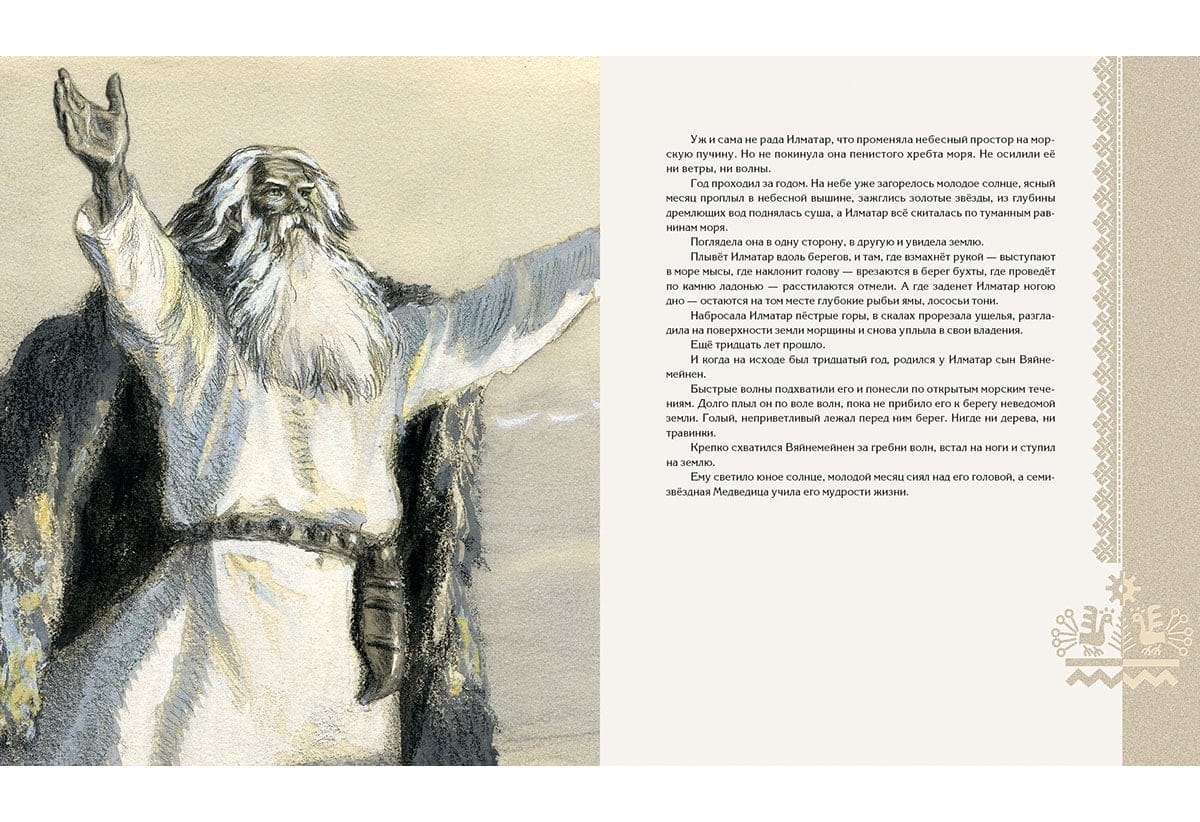 Детский (прозаический) вариант карело-финского эпоса «Калевала» появился в нашей стране в 1953 году. Именно в тот год вышла книга, содержавшая пересказ Александры Любарской, проиллюстрированный Николаем Кочергиным. И для автора текста, и для автора иллюстраций «Калевала» стала темой, к которой они обращались на протяжении нескольких десятилетий, перерабатывая и дополняя начальные версии. Писатель продолжала шлифовать фразы, а художник делал всё новые и новые листы, стремясь к предельной образности рисунка. В итоге Н. Кочергин создал две самостоятельные версии книги: чёрно-белую и цветную. Первая считается более сильной, более отвечающей северной теме эпоса, более пронзительной, что ли. Однако чёрно-белая версия на самом деле- тоже цветная. Похоже, чёрно-белой она оказалась потому, что тогдашние полиграфисты просто не смогли воспроизвести сложные оттенки, придуманные художником. Издательский дом «НИГМА» возвращает читателям чёрно-белую «Калевалу» в том виде, в котором её создал Николай Кочергин. При этом мы посчитали возможным включить в книгу цветные полностраничные иллюстрации, выполненные мастером для более поздней версии «Калевалы». Карело-финский эпос в пересказе для детей Александры Любарской. Около ста монохромных и цветных иллюстраций Николая Кочергина.