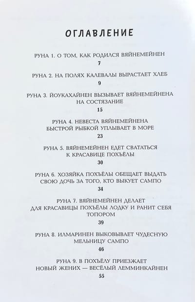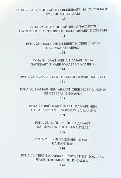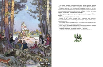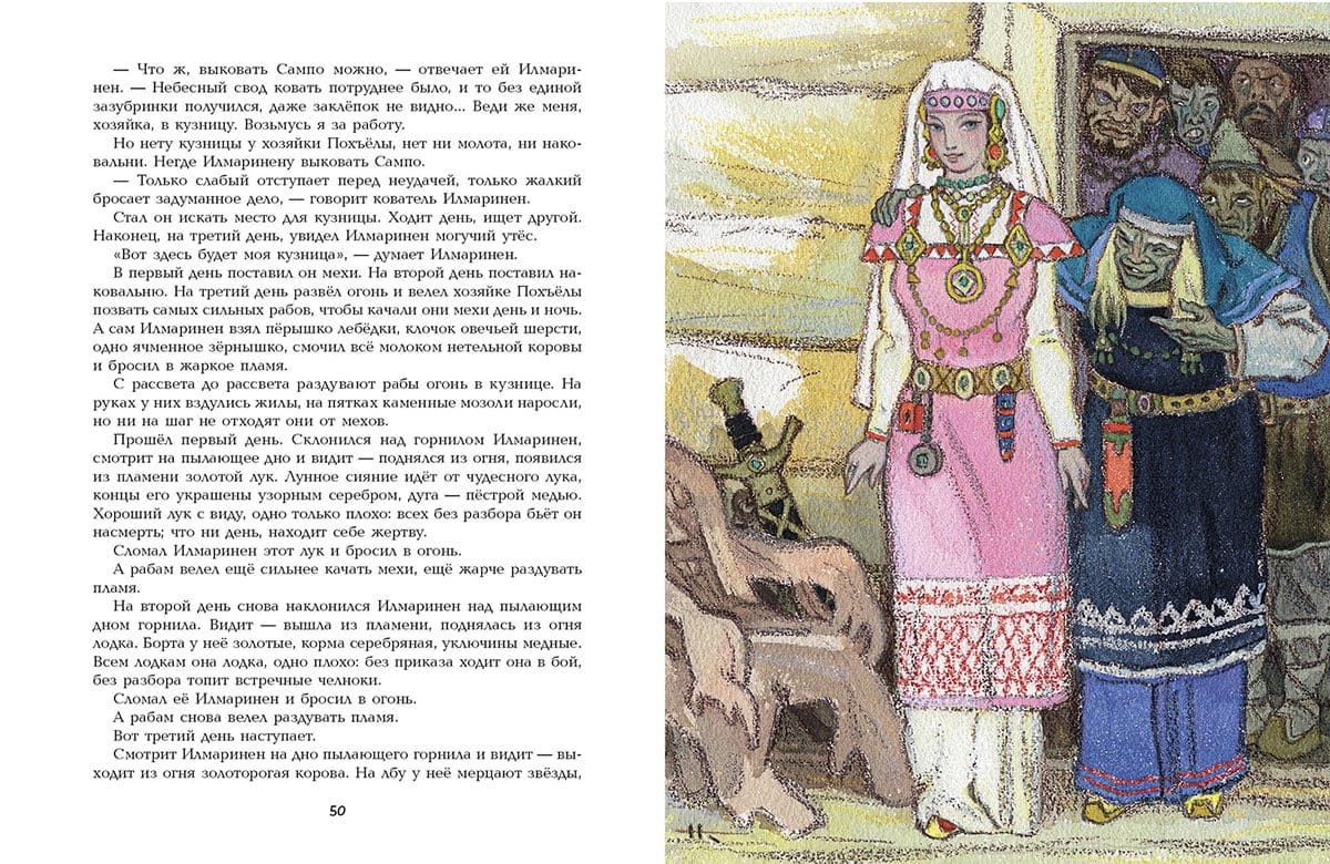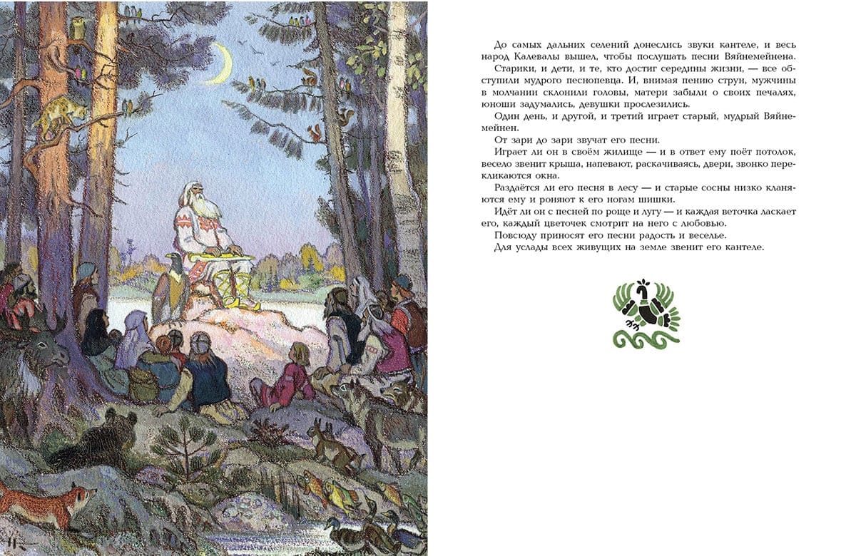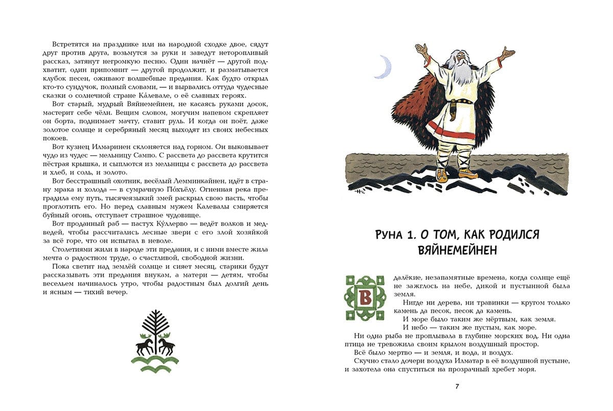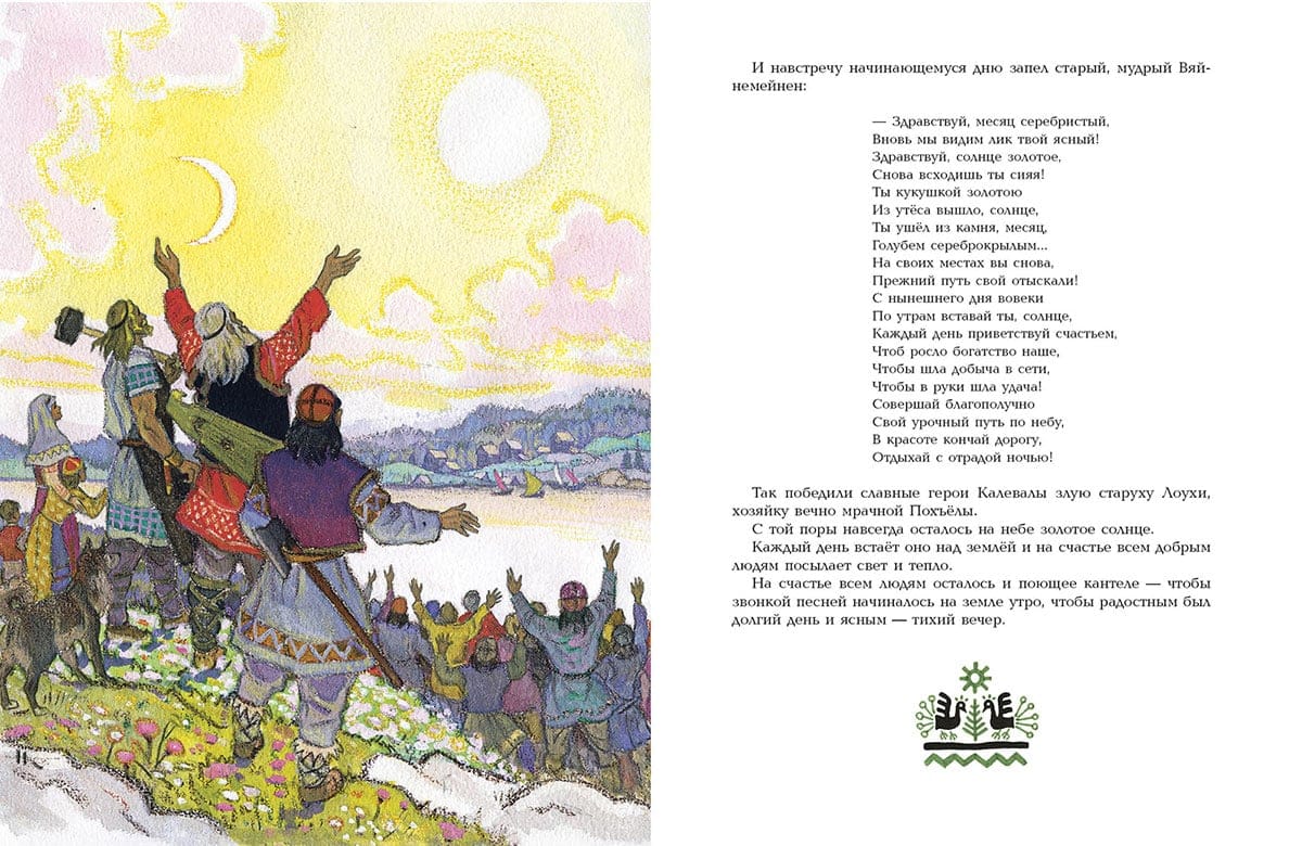Много веков назад в краю, где шумят высокие сосны и ели, а морские волны переговариваются с озерной гладью, сложились чудесные народные предания. Назывались они рунами и поколениями передавались из уст в уста, чтобы в XIX веке быть сложенными в единую поэму финским языковедом Элиасом Лённротом. Калевала - название солнечной и благодатной страны, в которой живут славные герои: вот поет свои вещие песни старый, мудрый Вяйнемейнен и все свершается по его слову; вот бесстрашный охотник, веселый Лемминкайнен едет свататься в сумрачную страну Похъёлу; а вот искусный кузнец Илмаринен кует чудесную мельницу Сампо, которая может одарить своего хозяина и мукой, и солью, и золотом. Герои отправляются в странствия и совершают подвиги, побеждают зло и восстанавливают справедливость – чтобы было на родной земле богатство и счастье, чтобы не знал добрый народ зла и беды. Легендарный карело-финский эпос пересказала для детей Александра Любарская, а воплотил в иллюстрациях Николай Кочергин.