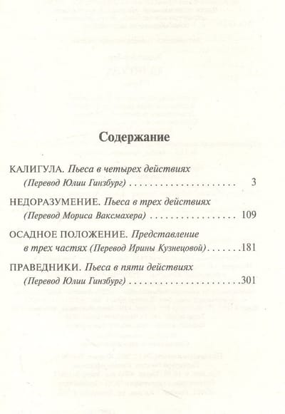 Трагедия одиночества на вершине власти – "Калигула". Трагедия абсолютного взаимного непонимания – "Недоразумение". Трагедия юношеского максимализма, ставшего основой для анархического террора, – "Праведники". И сложная, изысканная и эффектная трагикомедия "Осадное положение" о приходе чумы в средневековый испанский город. Две пьесы из четырех, вошедшие в этот сборник, относятся к наиболее популярным драматическим произведениям Альбера Камю, буквально не сходящим с мировых сцен. Две другие, напротив, известны только преданным читателям и исследователям его творчества. Однако все они – написанные в период, когда в его дружбе и соперничестве с Сартром рождалась и философия, и литература французского экзистенциализма – отмечены печатью гениальности Камю.
