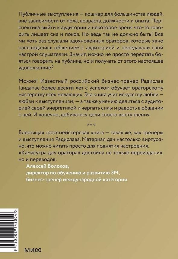 Радислав Гандапас, именитый российский бизнес-тренер, делится секретами обольщения публики. Читатель научится управлять вниманием слушателей, подавлять собственное волнение, грамотно структурировать выступление и держать зрительный контакт. Книга настоятельно рекомендуется тем, кто реализует себя в сферах, связанных с частыми выступлениями, и, несомненно, будет полезна каждому, кто хотел бы перестать бояться говорить на публике и начать наслаждаться этим процессом.