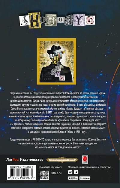 Старший следователь Следственного комитета Орест Волин берется за расследование кражи в доме известного коллекционера китайского фарфора. Среди украденных вещиц — китайский болванчик Будда Милэ, который не отличается особой ценностью, но превосходит размерами другие украденные предметы из редкой коллекции. В ходе розыскных действий Орест Волин узнает о знаменитом китайском алмазе «Слеза Будды», по легенде обладавшем огромной магической силой. В 1911 году алмаз был украден и переправлен за границу именно в таком китайском болванчике. Маловероятно, что алмаз до сих пор скрыт в фигурке, но теперь кому-то понадобилось бывшее хранилище сокровища. Кому и для чего? Тем временем старый знакомый Волина, генерал Воронцов, находит в дневниках надворного советника Загорского историю алмаза. И Волин берется за дневник, который рассказывает о событиях, происходящих в Китае и Тибете в 1914 году... Продолжение проекта AНОНИМYС погрузит вас в атмосферу Востока начала ХХ века, богатого на шпионские истории и дипломатические хитрости. Но главная загадка — кто же скрывается за псевдонимом автора?