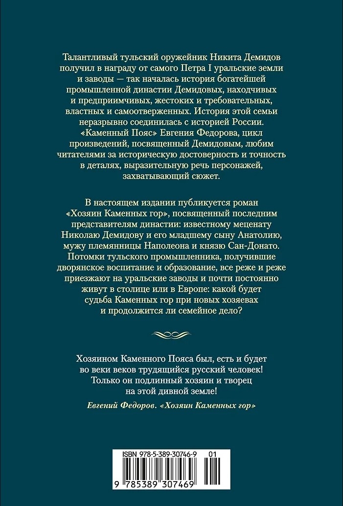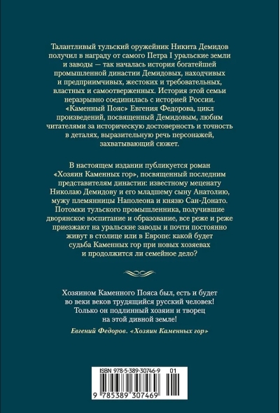 В настоящем издании публикуется роман «Хозяин Каменных гор», посвященный последним представителям династии: известному меценату Николаю Демидову и его младшему сыну Анатолию, мужу племянницы Наполеона и князю Сан-Донато. Потомки тульского промышленника, получившие дворянское воспитание и образование, все реже и реже приезжают на уральские заводы и почти постоянно живут в столице или в Европе: какой будет судьба Каменных гор при новых хозяевах и продолжится ли семейное дело?
