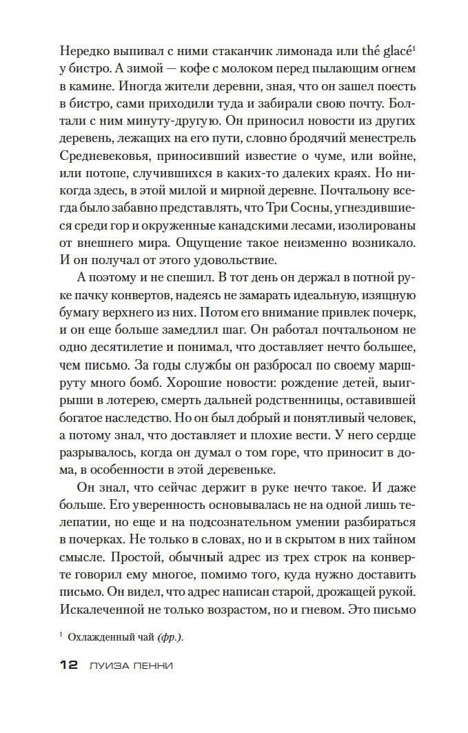 Каждый год в разгар лета Арман Гамаш с женой Рейн-Мари приезжают в бывшую охотничью усадьбу, притаившуюся среди диких канадских лесов, чтобы отпраздновать годовщину свадьбы. В этом элитном отеле все располагает к отдыху, однако отдохнуть, как всегда, не удается: у супругов Гамаш очень беспокойные соседи — респектабельное семейство Финни-Морроу. Похоже, этих богатых постояльцев связывают не только деньги, но и застарелая взаимная ненависть, замешанная на тайнах прошлого. Не она ли привела к гибели Джулии, дочери Чарльза Морроу, которую во время страшной грозы раздавил памятник ее собственного отца? Несчастный случай или преступление? Если это убийство, то его совершил кто-то из присутствующих, — такой железный вывод делает Арман Гамаш, однако следствие заходит в тупик. Ясно одно: произошло нечто противоестественное...