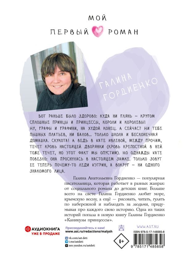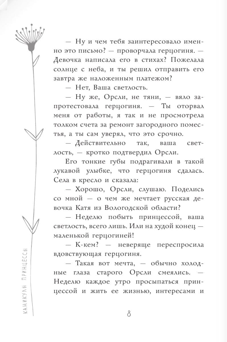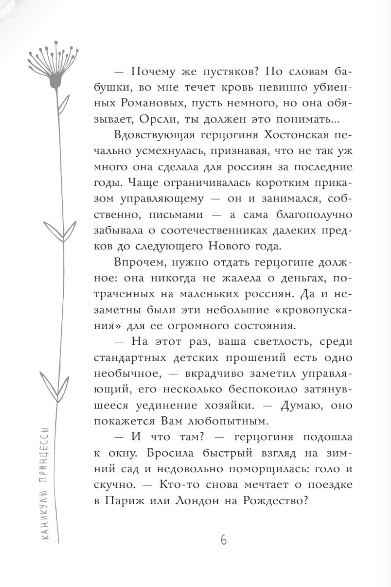 Катя Ивлева — обычная тринадцатилетняя девчонка. Она ходит в школу, скучает на уроках и мечтает о красивой жизни. Однажды Катя узнала, что в роду у нее были дворяне. И если бы не революция 1917 года, сейчас она бы кружилась на балу в пышном платье, а не сидела за партой. "Каникулы принцессы" Галины Гордиенко — это история о том, что наши мечты имеют свойство сбываться. Но так ли это здорово?
