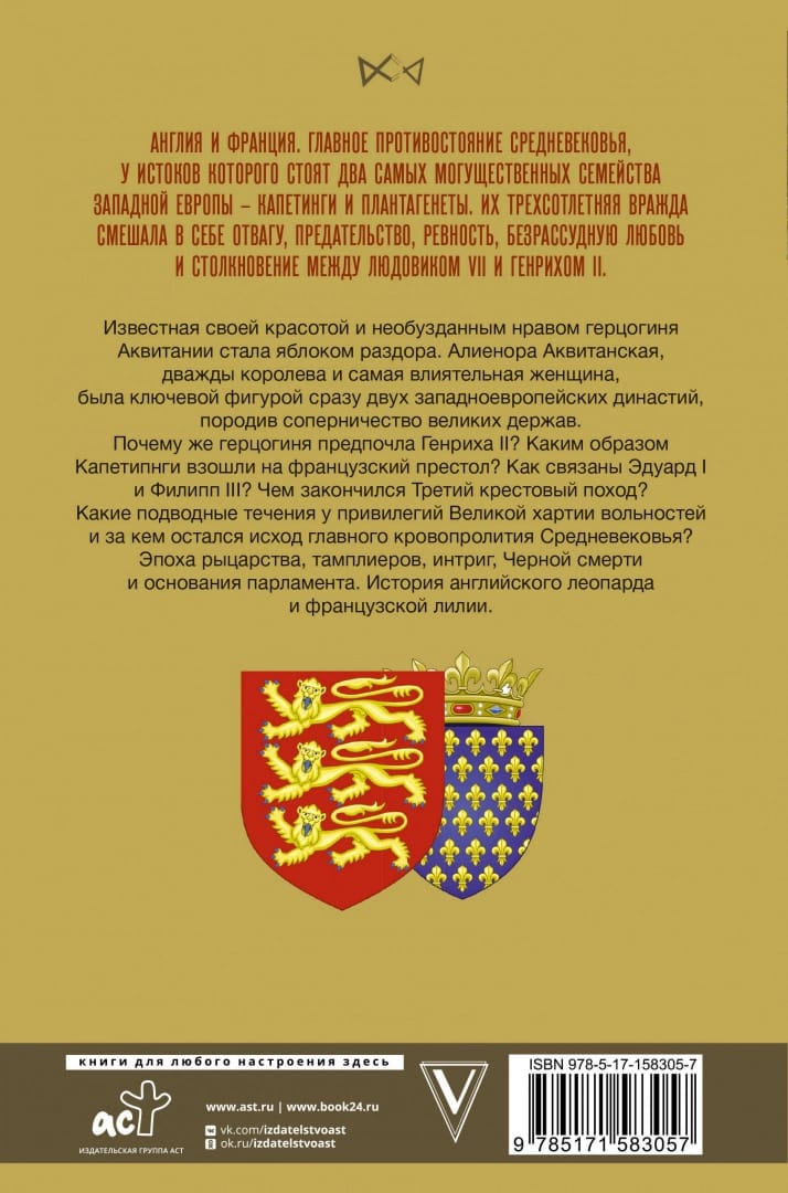 Англия и Франция. Главное противостояние Средневековья, у истоков которого стоят два самых могущественных семейства западной Европы – Капетинги и Плантагенеты. Их трехсотлетняя вражда смешала в себе отвагу, предательство, ревность, безрассудную любовь и столкновение между Людовиком VII и Генрихом II. Известная своей красотой и необузданным нравом герцогиня Аквитании стала яблоком раздора. Алиенора Аквитанская, дважды королева и самая влиятельная женщина, была ключевой фигурой сразу двух западноевропейских династий, породив соперничество великих держав. Почему же герцогиня предпочла Генриха II? Каким образом Капетипнги взошли на французский престол? Как связаны Эдуард I и Филипп III? Чем закончился Третий крестовый поход? Какие подводные течения у привилегий Великой хартии вольностей и за кем остался исход главного кровопролития Средневековья? Эпоха рыцарства, тамплиеров, интриг, Черной смерти и основания парламента. История английского леопарда и французской лилии.
