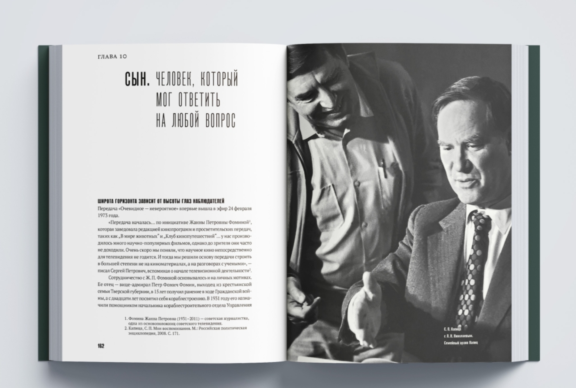 Петр Леонидович Капица — нобелевский лауреат, открывший эффект сверхтекучести жидкого гелия, создатель Института физических проблем АН СССР. Сын великого физика, Сергей Петрович Капица — почетный вице-президент РАЕН, создатель легендарной телепередачи «Очевидное — невероятное», сделавшей сложный мир науки доступным и интересным огромному числу зрителей.