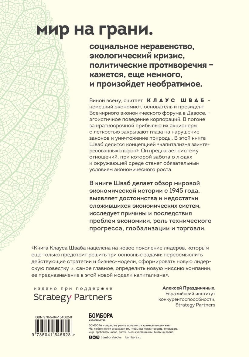 Переосмысление нашей глобальной экономики, чтобы она стала более устойчивой и процветающей. Шваб ищет реальные причины недостатков нашей системы и находит решения на основе лучших практик со всего мира в таких разных странах, как Китай и Дания. , Эфиопия, Германия, Индонезия, Новая Зеландия и Сингапур. Клаус Шваб, основатель и бессменный президент Всемирного экономического форума в Давосе.