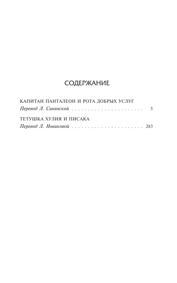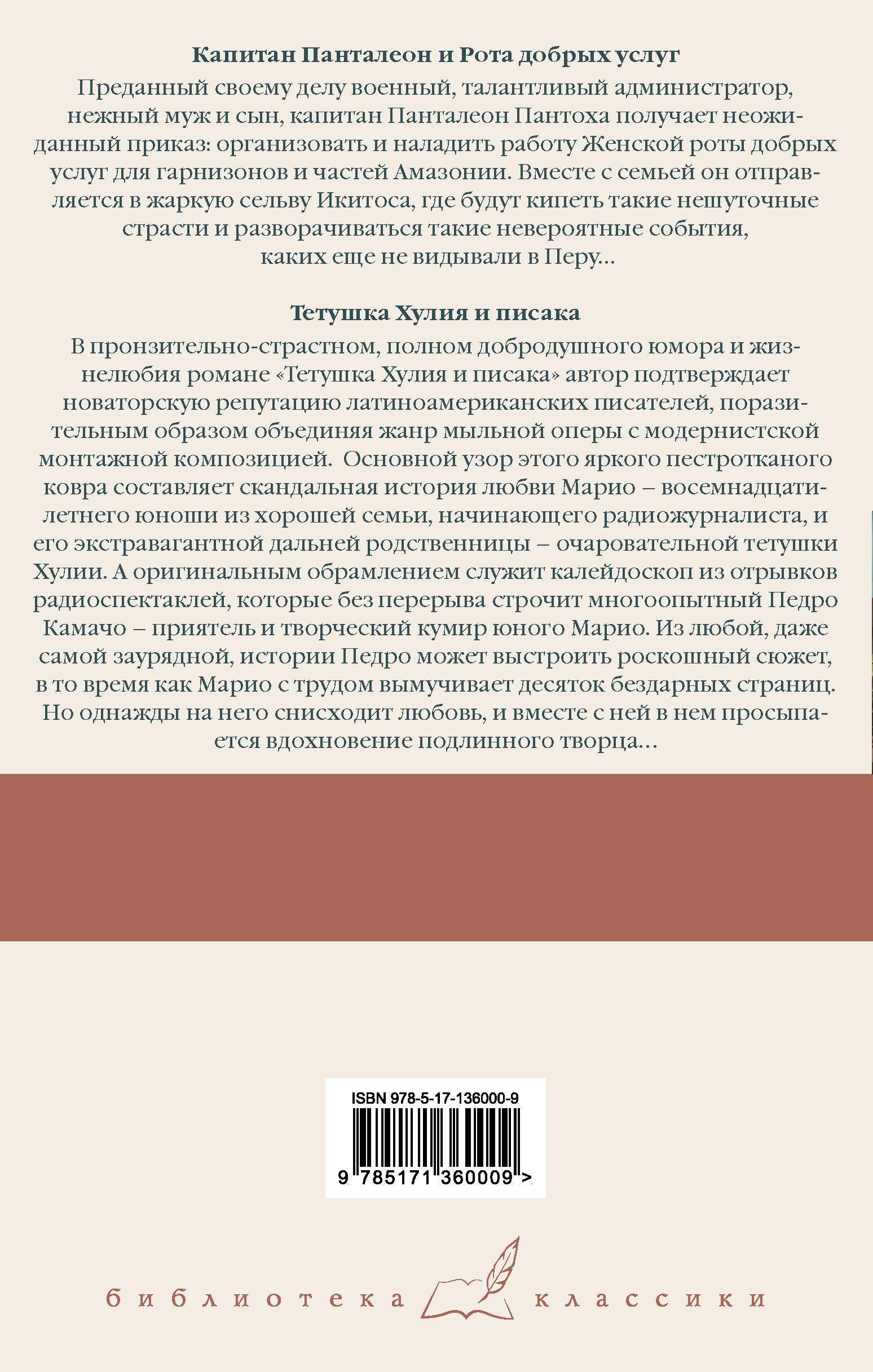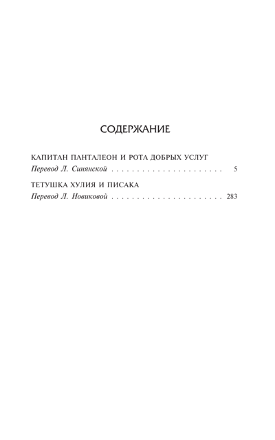 В сборник включены два произведения автора: роман «Капитан Панталеон и Рота добрых услуг» и автобиографическое повествование о первой любви – «Тетушка Хулия и писака».