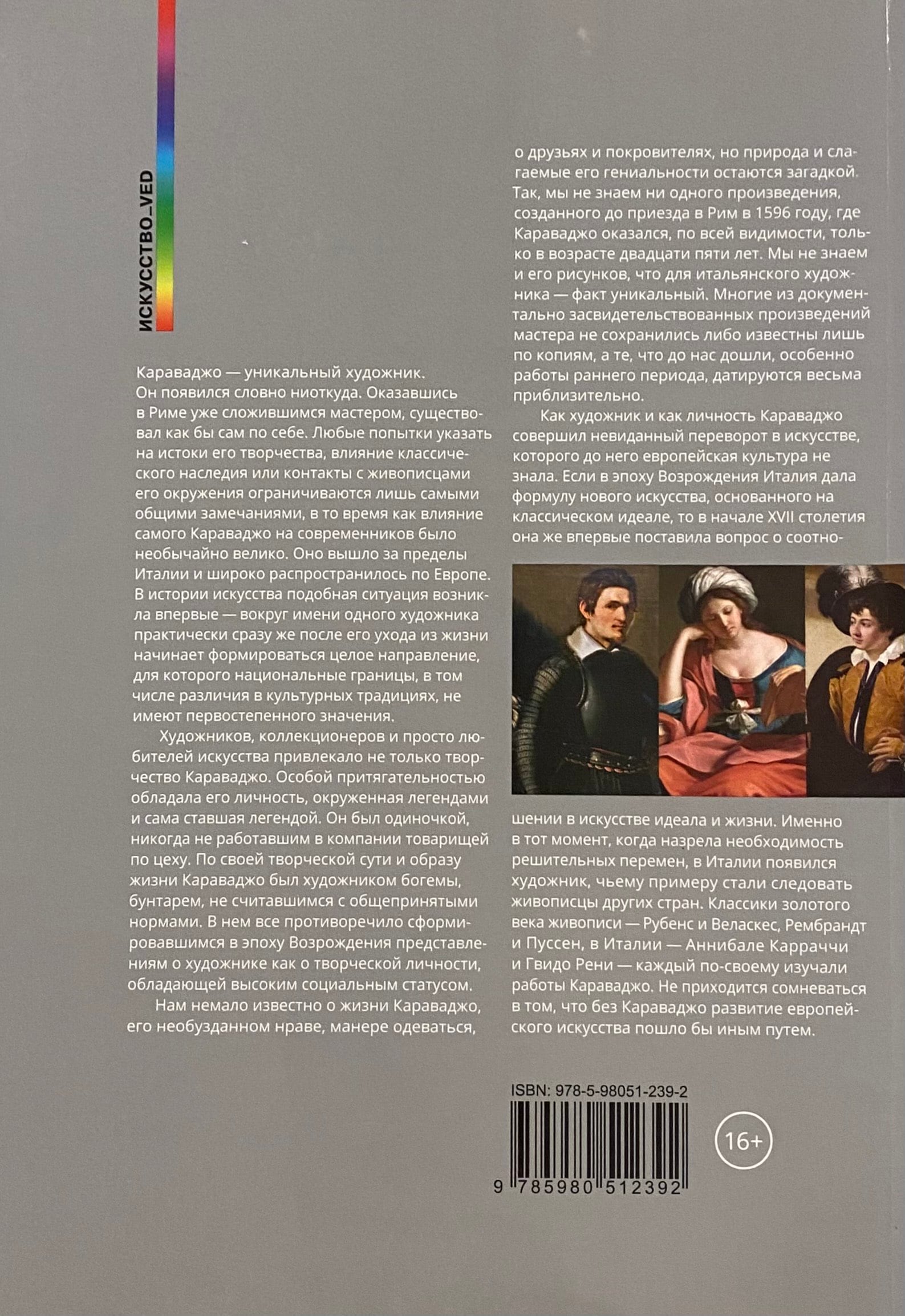 Книга Виктории Марковой, специалиста по искусству Италии эпохи Возрождения и барокко, посвящена итальянской живописи XVII века — ​от момента становления нового художественного языка до утверждения барокко, господствовавшего в Европе на протяжении почти двух столетий. Центральными фигурами здесь являются Караваджо, Аннибале Карраччи и их современники, работавшие в Риме и за его пределами. Идея книги родилась из личного опыта автора, а основой послужили публикации и атрибуции разных лет, а также тексты, написанные специально для этого издания. В них подняты важные вопросы, помогающие понять поворотный для всей европейской культуры период, когда между собой активно взаимодействовали самые разные тенденции.