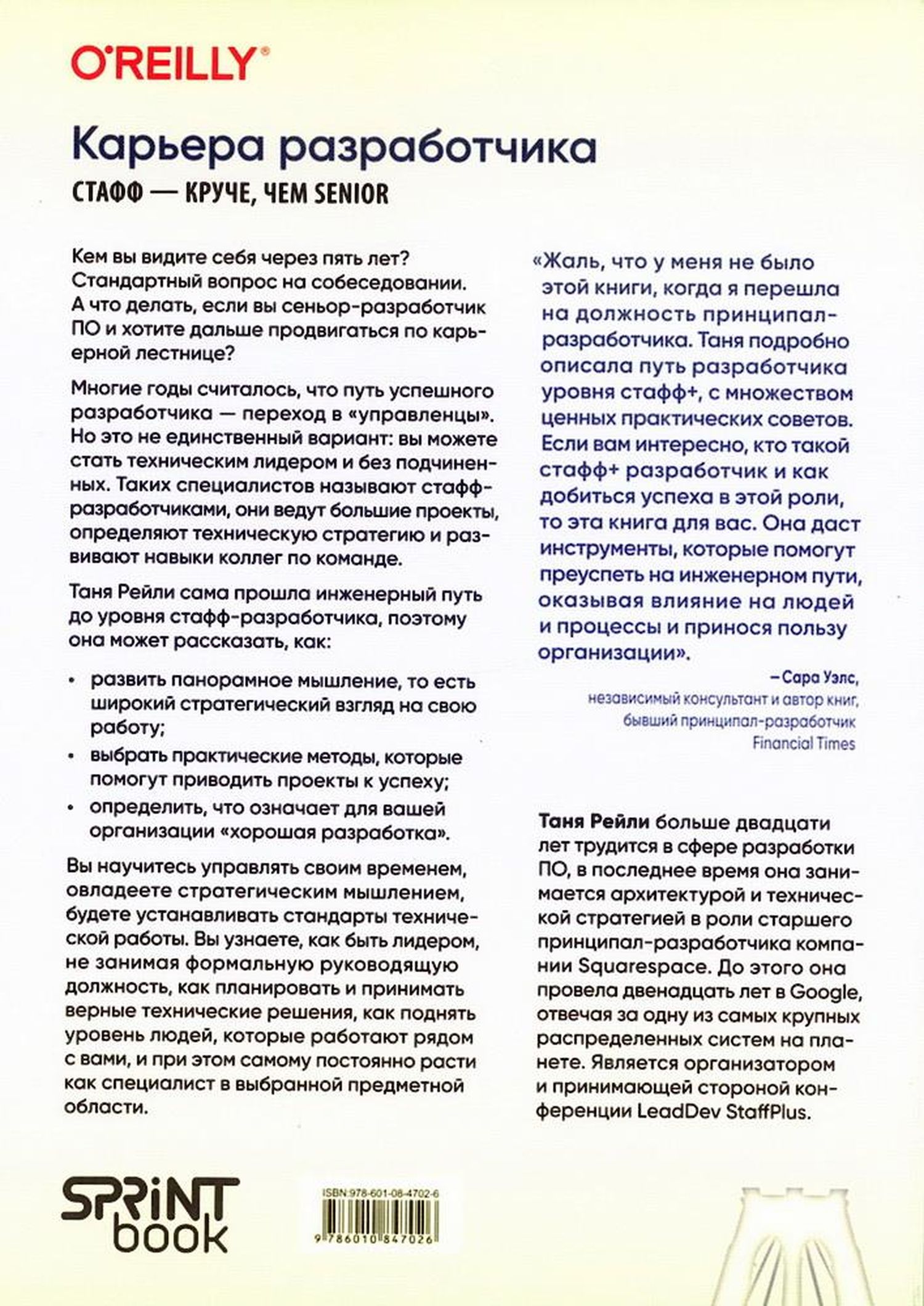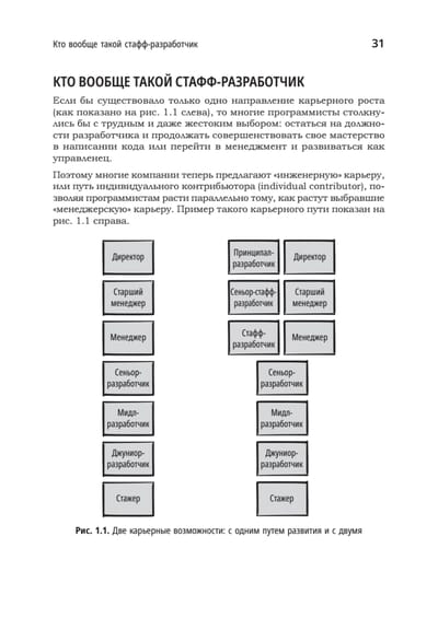 Кем вы видите себя через пять лет? Стандартный вопрос на собеседовании. А что делать, если вы сеньор-разработчик ПО и хотите дальше продвигаться по карьерной лестнице? Многие годы считалось, что путь успешного разработчика — переход в «управленцы». Но это не единственный вариант: вы можете стать техническим лидером и без подчиненных. Таких специалистов называют стафф-разработчиками, они ведут большие проекты, определяют техническую стратегию и развивают навыки коллег по команде. Вы научитесь управлять своим временем, овладеете стратегическим мышлением, будете устанавливать стандарты технической работы. Вы узнаете, как быть лидером, не занимая формальную руководящую должность, как планировать и принимать верные технические решения, как поднять уровень людей, которые работают рядом с вами, и при этом самому постоянно расти как специалист в выбранной предметной области.