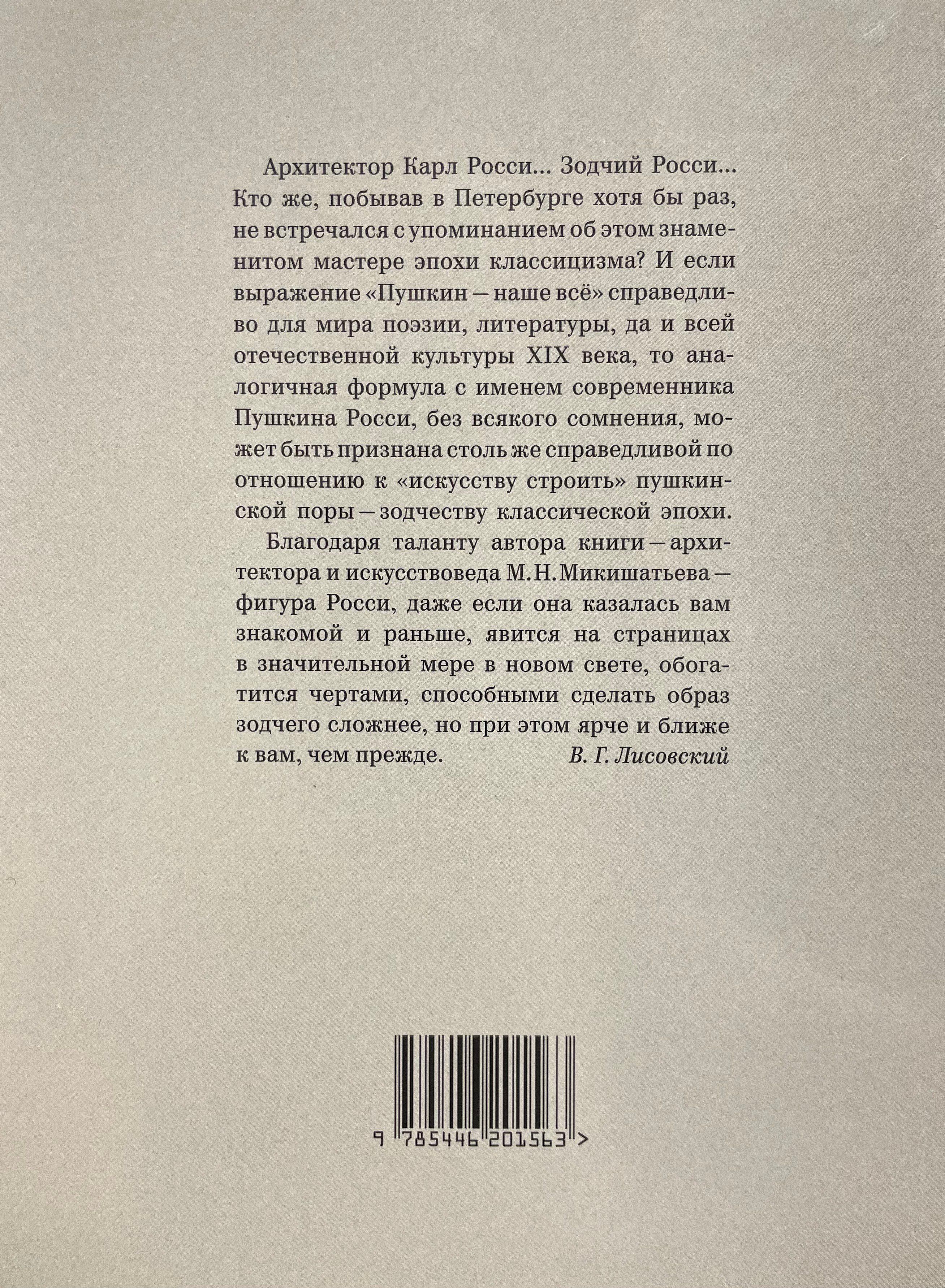 Книга посвящена изучению и анализу творческого метода великого архитектора. На примерах архитектурных шедевров К. Росси подробно сформулированы принципы, названные автором «алгоритмом проектного творчества» гениального зодчего. Исследование иллюстрируют проектные чертежи зодчего, историческая и современная фотосъёмка.