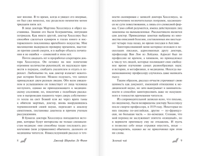 История из практики врача-психиатра Мартина Хесселиуса, рассказанная юной девушкой Лорой, которая вместе с отцом живет в замке среди бесконечных лесов Австро-Венгерской империи и ведет уединенный образ жизни. Все меняется с появлением прекрасной незнакомки по имени Кармилла, тогда и начинают происходить странные события: крестьяне умирают один за другим, Лора заболевает и чахнет на глазах, а по ночам ее мучают кошмары. Кто на самом деле эта загадочная Кармилла и какое отношение имеет к происходящему? Помимо этой новеллы в сборник вошли и другие истории доктора Хесселиуса: «Зеленый чай», «Давний знакомый», «Судья Харботтл» и «Номер в гостинице „Летящий дракон“».
