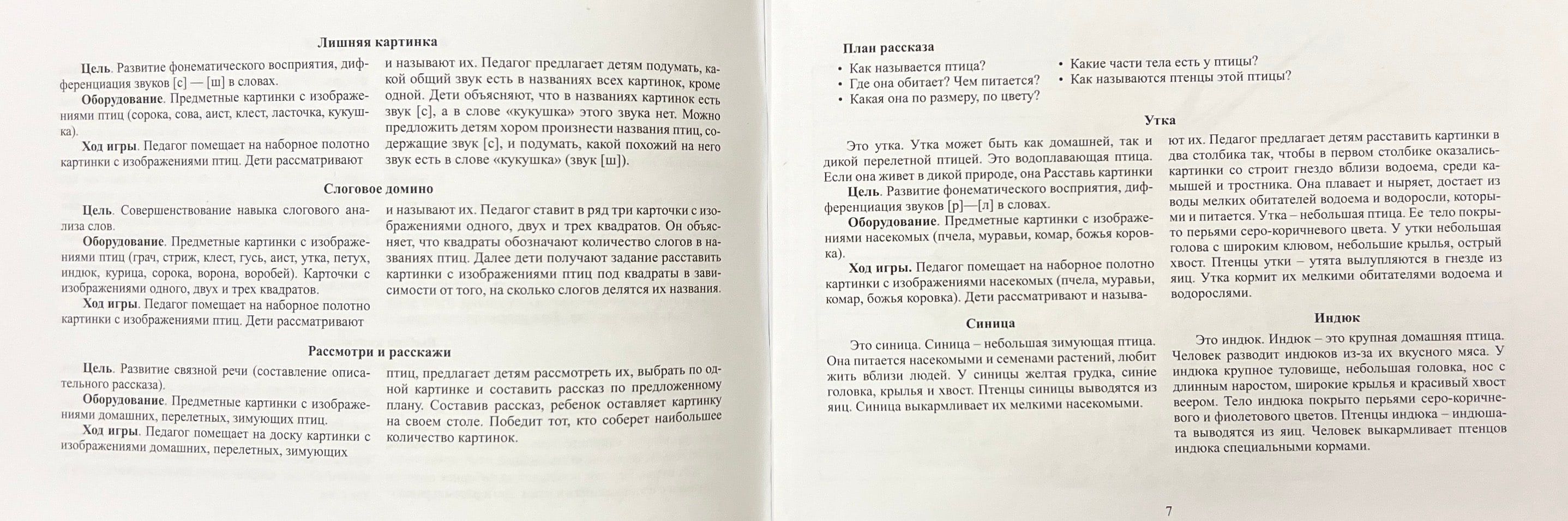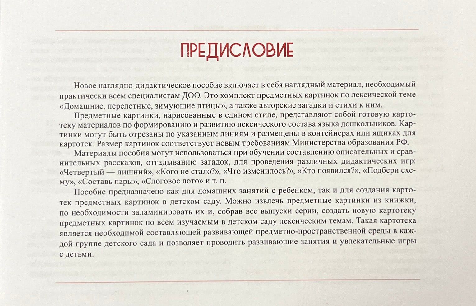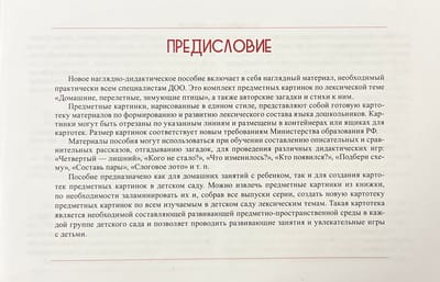 Пособие включает в себя наглядный дидактический материал, необходимый практически всем специалистам ДОО. Это комплект предметных картинок по лексическим темам «Домашние птицы», «Перелетные птицы», «Зимующие птицы», а также авторские загадки, стихи и дидактические игры с использованием материалов пособия.
