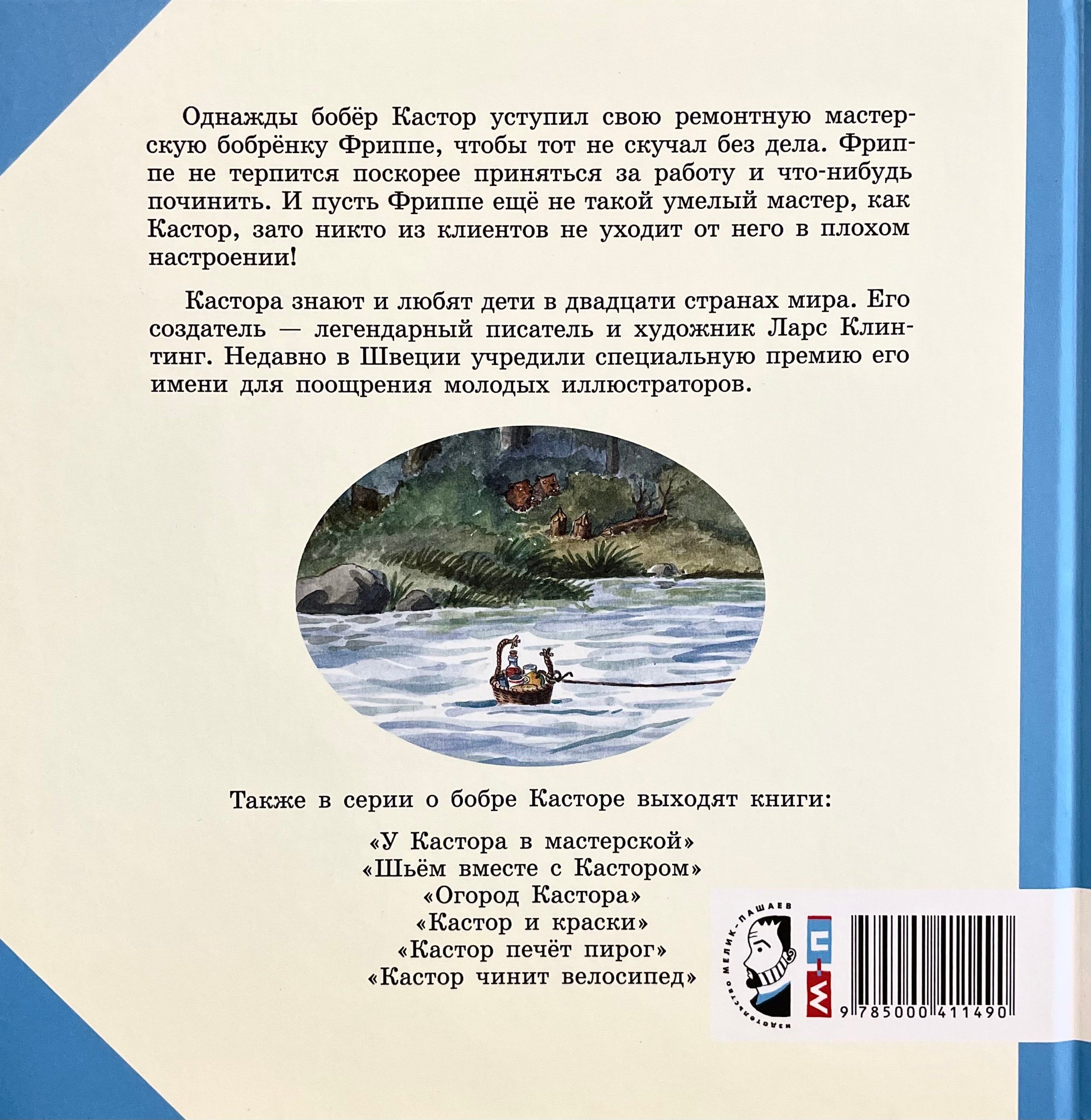 Как-то раз бобёр Кастор уступил на время свою ремонтную мастерскую бобрёнку Фриппе, чтобы тот не скучал без дела. Фриппе не терпится поскорее что-нибудь починить, ведь Кастор его уже многому научил: и шить, и красить, и столярничать. Благодаря богатой фантазии бобрёнка ремонтные работы приносят самые неожиданные результаты: к примеру, сломанный велосипед господина Бобриксона превращается в цирковой уницикл, халат госпожи Хвостберг – в элегантный шарфик, а гладильная доска господина Бульквиста – в роликовую доску. «Вообще-то получилось не совсем то, что вы хотели, – говорит Фриппе. – Но может, на что другое сгодится?» Впрочем, никто из клиентов не уходит от Фриппе в плохом настроении, а это – самое главное. Ведь если работаешь с душой, то и результат всем понравится. Бобра Кастора знают и любят дети в двадцати пяти странах мира. Его создатель - легендарный шведский детский писатель и иллюстратор Ларс Клинтинг, обладатель множества международных наград.