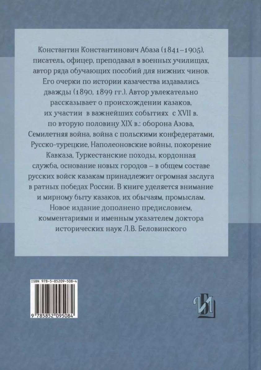 Константин Константинович Абаза (1841-1905), писатель, офицер, преподавал в военных училищах, автор ряда обучающих пособий для нижних чинов. Его очерки по истории казачества издавались дважды (1890, 1899 гг.). Автор увлекательно рассказывает о происхождении казаков, их участии в важнейших событиях с XVII в. по вторую половину XIX в.: оборона Азова, Семилетняя война, война с польскими конфедератами, Русско-турецкие, Наполеоновские войны, покорение Кавказа, Туркестанские походы, кордонная служба, основание новых городов - в общем составе русских войск казакам принадлежит огромная заслуга в ратных победах России. В книге уделяется внимание и мирному быту казаков, их обычаям, промыслам.