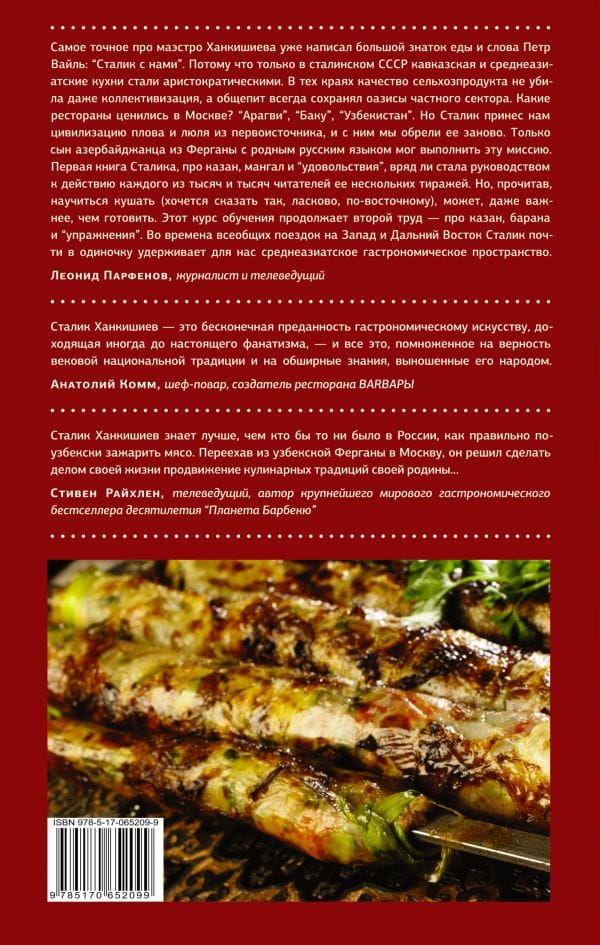 Если первая книга Сталика Ханкишиева была «книгой риса», то вторая - настоящая «энциклопедия мяса». Точнее, речь о баранине - важнейшем исходном продукте для кулинарии стран Средней Азии и Азербайджана, гастрономической культуре которых автор посвящает свой труд. Как и прежде, Сталик убеждает: в гастрономии важнее всего - самому понимать суть дела, а не заучивать чужие предписания и рецепты. Чтобы так же вкусно, с тем же увлечением и мастерством, как автор, готовить самостоятельно, нужен настоящий интерес к делу, а еще - немного интуиции и свободная фантазия. И потому самое главное в этой книге - даже не рецепты. Последовательно, шаг за шагом, Сталик объясняет: как правильно выбрать на рынке самое лучшее мясо, как затем разделать его, ничего не потеряв и не испортив, как определить идеальное предназначение для каждого кусочка этого мяса и как в конце концов приготовить из него замечательно вкусные и своеобразные блюда. А благодаря уникальным авторским фотографиям, очевидными становятся самые важные детали, и весь рассказ обретает дополнительный смысл и расцвечивается яркими сочными красками.