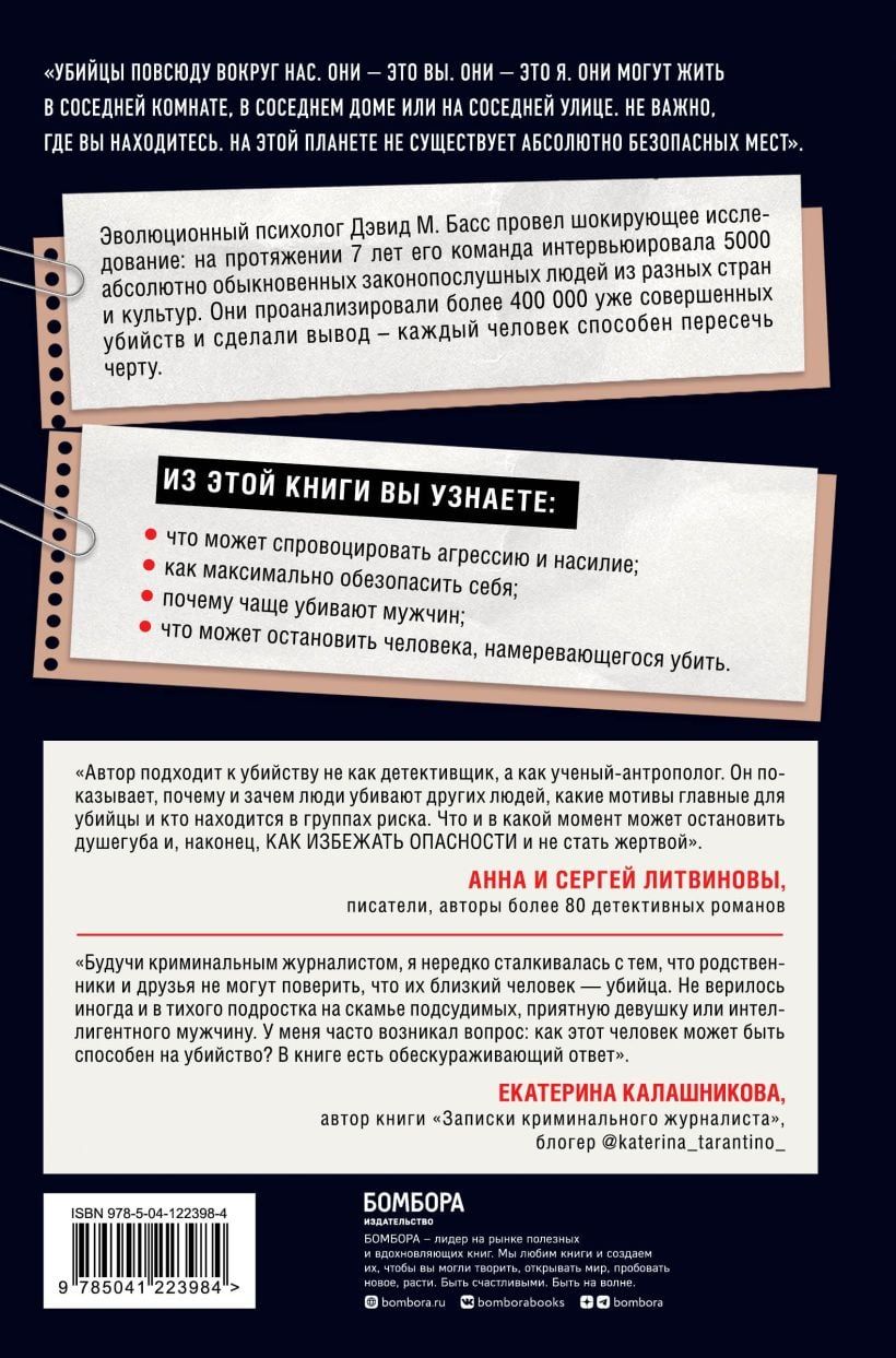 Интуитивно нам кажется, что убийцы — это скрытные, подозрительные люди, асоциальность которых можно увидеть за версту. Однако на самом деле большинство убийц — те, кто до момента преступления всем казались совершенно нормальными. Эволюционный психолог Дэвид М. Басс провел шокирующее исследование: на протяжении 7 лет его команда проинтервьюировала 5000 абсолютно обыкновенных законопослушных людей из разных стран и культур. Они проанализировали более 400 000 уже совершенных убийств и сделали вывод — каждый человек способен пересечь черту. В этой книге люди делятся своими фантазиями об убийствах, которые заставят по-новому взглянуть на наших соседей и друзей. Дэвид М. Басс поделился реальными историями, в которые трудно поверить, и описал дело, в котором присяжные отказались призвать убийцу к ответственности.