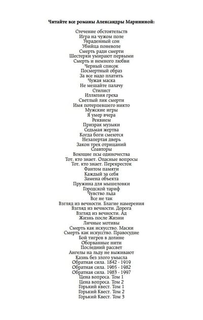 Однако, властям Вербицка не до московских инвесторов. В самый разгар предвыборной гонки по городу прокатилась волна таинственных убийств экологов. Люди во всем винят чиновников. Уж больно рьяно мэр и его друзья отстаивают звероферму, притаившуюся в глухом таежном лесу. А ведь говорят, что именно она — ферма — вредит местной экологии. Разумеется, это дело увлекло Каменскую намного сильнее, чем поиски какого-то там участка…