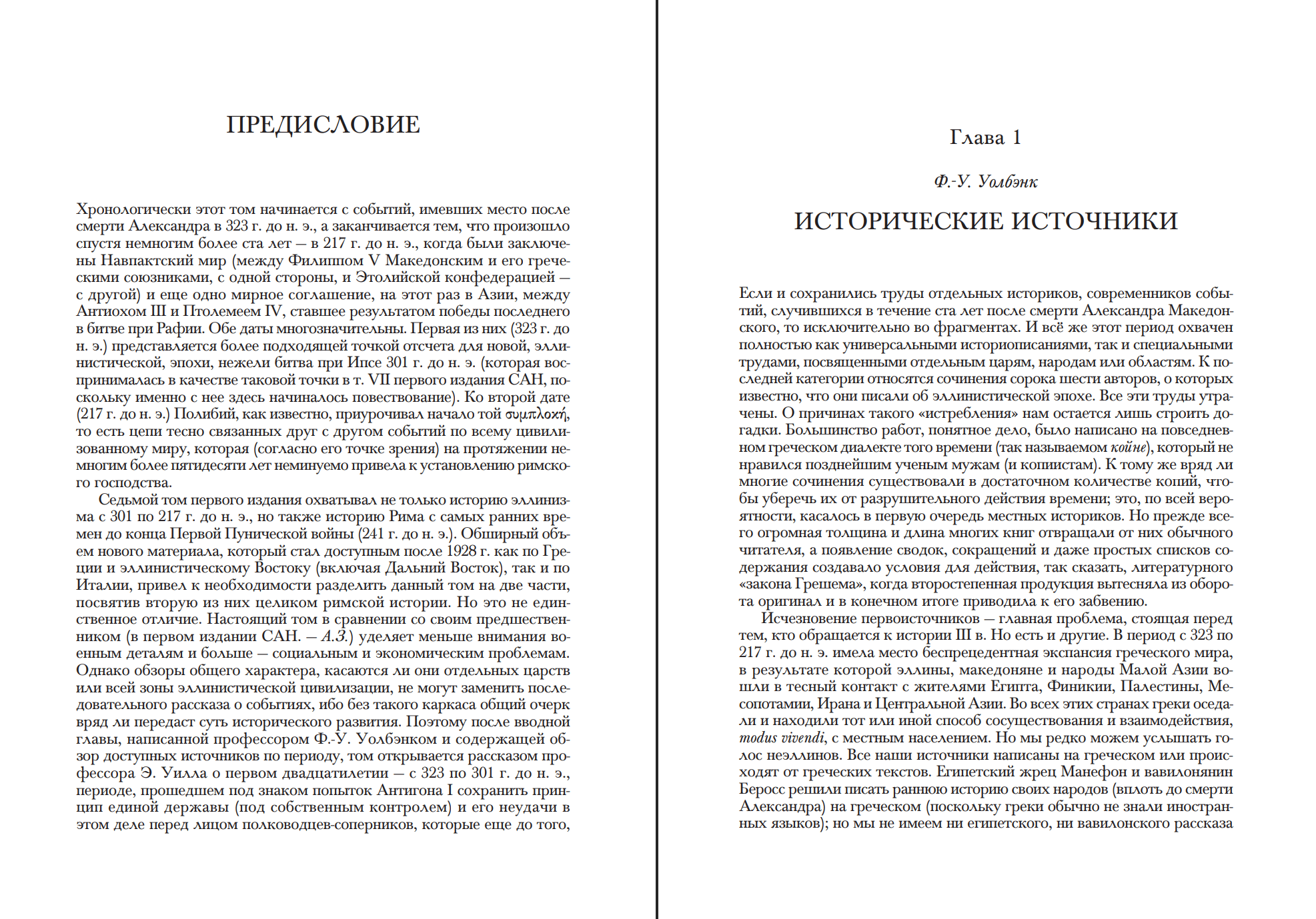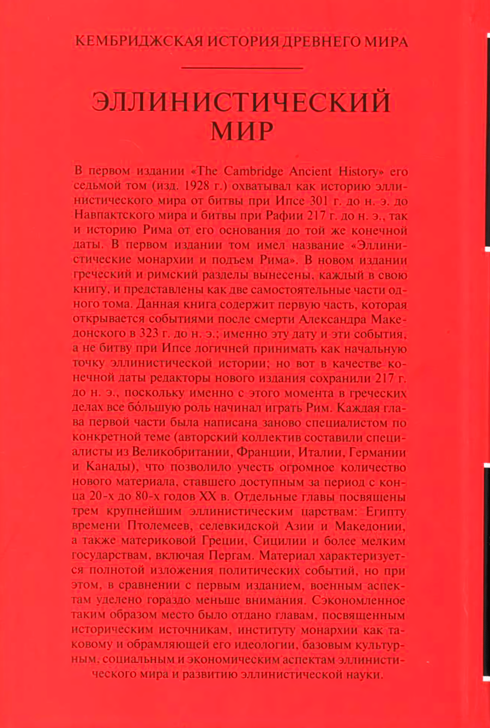 В первом английском издании «Кембриджской истории древнего мира» («The Cambridge Ancient History») его седьмой том, увидевший свет в 1928 г., охватывал под одним переплетом как историю эллинистического мира от битвы при Ипсе 301 г. до н. э. до Навпактского мира и битвы при Рафии 217 г. до н. э., так и историю Рима от его основания до той же конечной даты. В первом издании том имел название «Эллинистические монархии и подъем Рима». В новом английском издании, по которому и осуществлен русский перевод, греческий и римский разделы вынесены, каждый, в свою книгу и представлены как две самостоятельные части одного тома. Данная книга содержит первую часть, которая открывается событиями после смерти Александра Македонского в 323 г. до н. э.; именно эту дату и эти события, а не битву при Ипсе логичней принимать как начальную точку эллинистической истории; но вот в качестве конечной даты редакторы нового издания сохранили 217 г. до н. э., поскольку, как отмечает Полибий, именно с этого момента в греческих делах все бóльшую роль начинал играть Рим. Каждая глава первой части была написана заново специалистом по конкретной теме (авторский коллектив составили антиковеды из Великобритании, Франции, Италии, Германии и Канады), что позволило учесть огромное количество нового материала, ставшего доступным за период с конца 20-х до 80-х годов XX в. Отдельные главы посвящены трем крупнейшим эллинистическим царствам: Египту времени Птолемеев, селевкидской Азии и Македонии, а также материковой Греции, Сицилии и более мелким государствам, включая Пергам. Материал характеризуется полнотой изложения политических событий, которым дается всесторонняя оценка, но при этом, в сравнении с первым изданием, военным аспектам уделено гораздо меньше внимания. Сэкономленное таким образом место было отдано главам, посвященным историческим источникам, институту монархии как таковому и обрамляющей его идеологии, базовым культурным, социальным и экономическим аспектам эллинистического мира и развитию эллинистической науки, прежде всего в отношении ее применения в мирное и военное время.